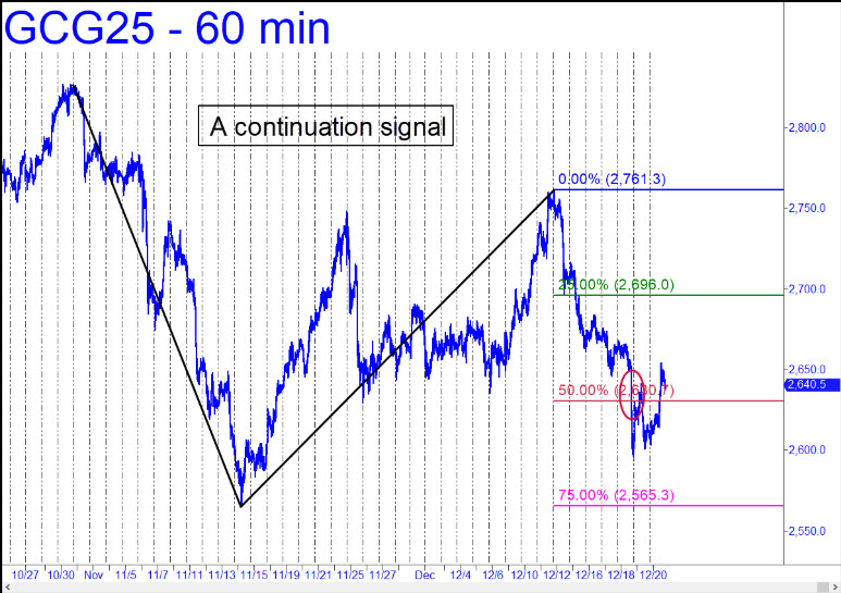 The three-day dance around p=2630.70 left me mildly bearish when the week ended, but not so bearish that I would recommend a ‘mechanical’ short at the green line. Although the bounce to the line will have occurred off our sweet spot midway between p and p2, the tedious, irregular C-D leg let off enough steam to flatten A-B’s bearish energy. That energy is what makes ‘mechanical’ trades work and the reason why this gambit is unlikely to offer the edge we seek. In any event, the D target at 2500.00 remains my worst-case low between now and December 31. It will also provide good odds for bottom-fishing with a tight stop-loss.