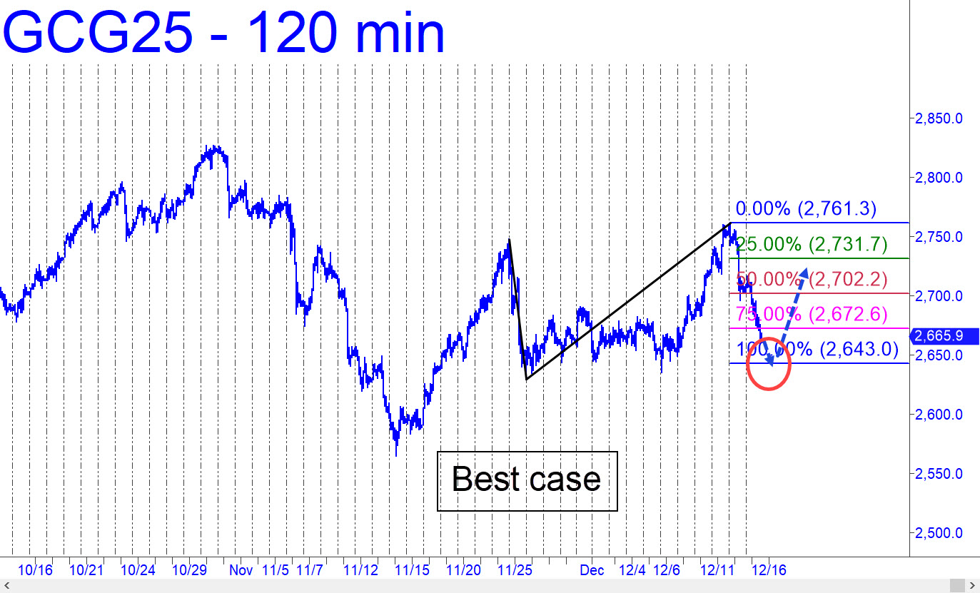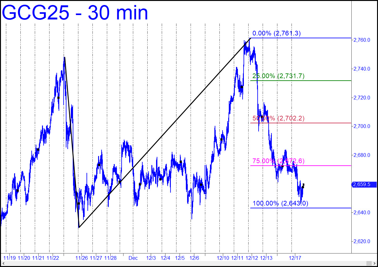 We’ll find out soon whether Mr Slammy has bigger ambitions than the so-far two-day thrashing he has administered to gold futures. The small reverse pattern shown yields a target at 2643.00 that is probably the best bulls can hope for. You can bottom-fish there with a ‘camouflage’ trigger created from five-minute-or-less bars, but if this ‘hidden’ support is easily exceeded, brace for more downside to at least 2628.10. That’s the midpoint Hidden Pivot support of a big pattern (A=2826.30 on 10/3) associated with a D target at 2497.40, a worst-case target for 2024. ______ UPDATE (Dec 17, 12:52 p.m.): The futures have turned higher from within an inch of the 2643.00 minimum downside target given above. A relapse would encounter ‘voodoo’ support near 2632.70 that can be bottom-fished with a small-pattern (aka ‘camouflage’) trigger. Otherwise, the so-far modest bounce will need to touch 2683.50 to suggest a recovery and become interesting.