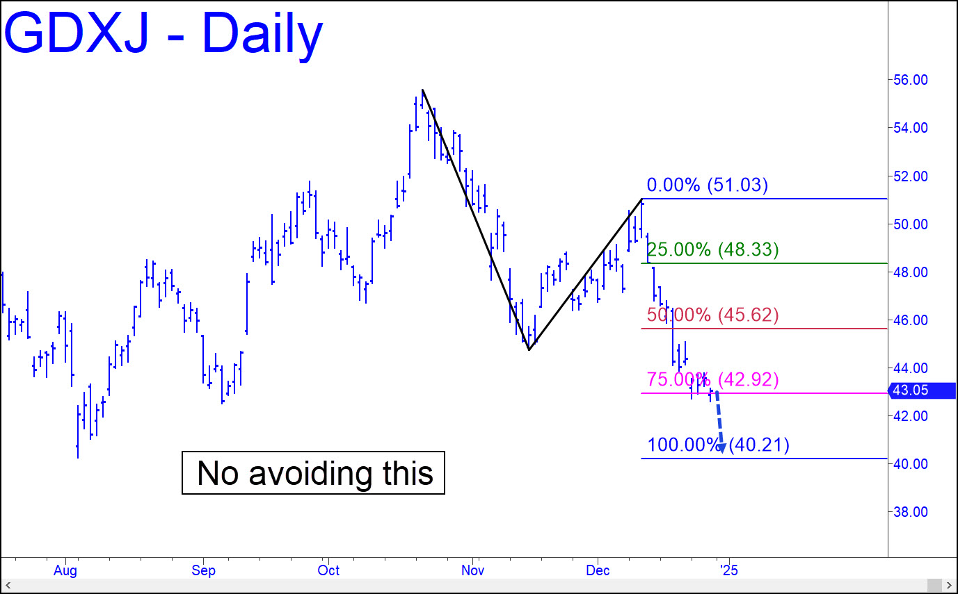 Nothing can prevent more slippage down to at least D=40.21, the Hidden Pivot target of the pattern shown. That will amount to a 27% decline since this symbol topped near 56 in October. The target is unlikely to be usable for conventional bottom-fishing, unfortunately, since it is coincident with a low recorded back in August that is certain to attract the attention of the herd. The pattern is too obvious as well, but it is also sufficiently compelling for us to assume the bear cycle begun in October will not much exceed it. If you plan to bottom-fish, use a ‘counterintuitive’ trigger with an rABC pattern that comes from the 15-minute chart or lower. The point ‘c’ low can be planted just above the August low (40.26), equal to it, or slightly below it, since a bounce from within the midst of these levels will be unavoidable.