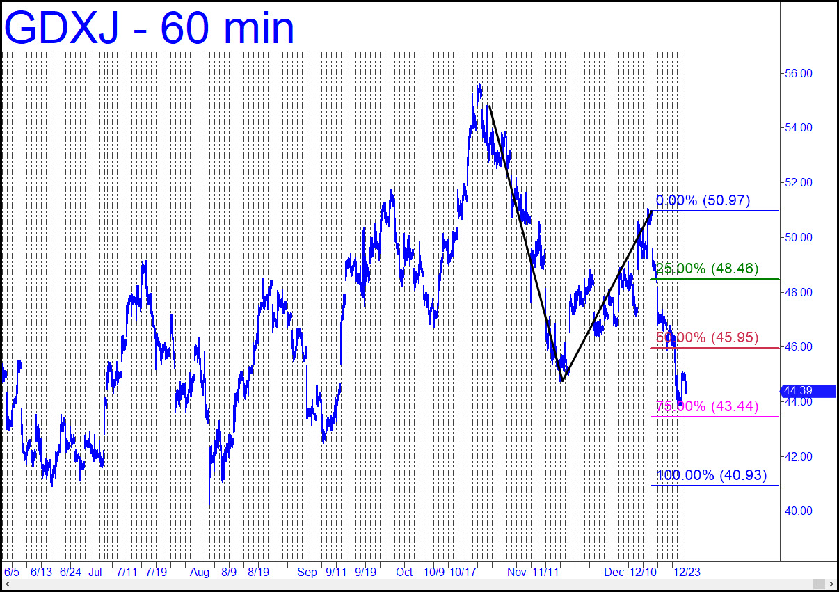 GDXJ is probably within no more than five points of groping its way to the bottom of the textbook head-and-shoulders pattern shown in the hourly chart (see inset). If it’s going to revive sooner rather than later, though, the secondary pivot at 43.44 would be a logical place for this to occur. You can bottom-fish there with a tight stop-loss, using expiring call options if you’ve got the chops. I’ve used a dubious one-off ‘A’ high here, and the pattern could turn out to be governed by the marquee high at 55.58, so plan accordingly.
