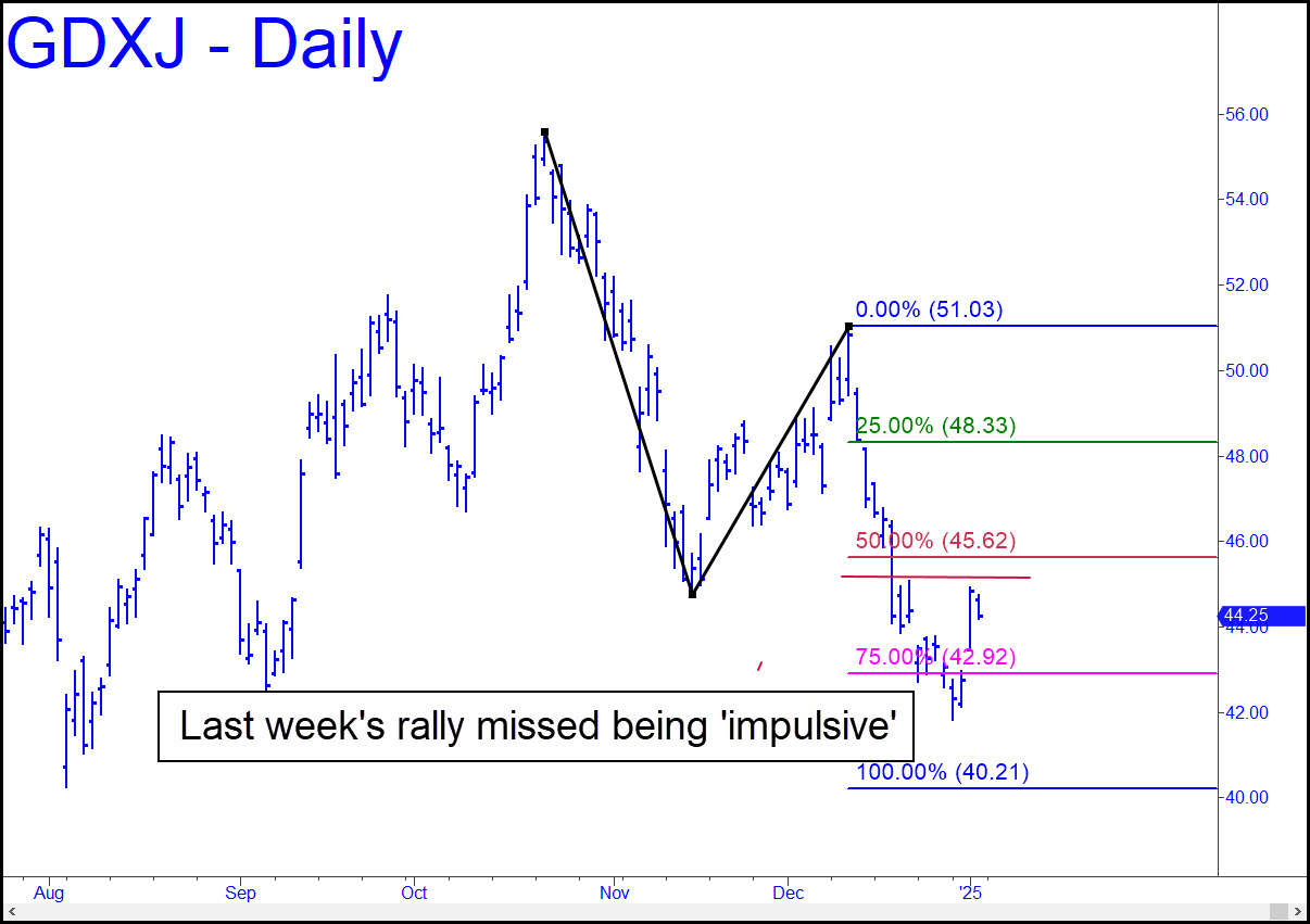 With the current focus on gold and silver futures calling for moderately bearish outcomes, I’ve selected a GDXJ chart that shows a potential best-case scenario. It implies that the 47.14 low that ended the week came close to fulfilling a minor d correction target at 46.69. If so, and the gold miners are close to an interim bottom, that would imply bullion prices are also about to turn higher. Regardless, GDXJ can be bottom-fished at ‘d’ with a reverse-pattern trigger of small degree (i.e., ‘camouflage’). Alternatively, if sellers simply shred ‘d’, expect more downside to at least 44.75 (daily chart, A= 50.57 on 11/7). _______ UPDATE (January 5): Last week’s rally failed to generate an impulse leg on the daily chart because its 44.91 apex fell 18 cents shy of surpassing the 45.o8 ‘external’ peak recorded on December 20. This disappointing price action implies that the 40.21 ‘D’ target is still likely to be reached.