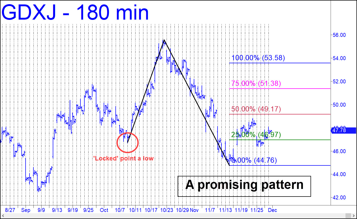 With its ‘locked’ point ‘a’ low, the pattern shown looks reliable for our purposes, whether trading or forecasting. It is not a healthy sign that the rally off the 44.76 low recorded on November 14 failed on the first attempt to reach the red line, a midpoint Hidden Pivot at 49.17. Bulls could still pull it off, but if GDXJ dips below C=44.76, negating the pattern, that would be more than a mild discouragement. The weakness so far is especially dispiriting because of the power of the impulse leg that took GDXJ quickly from 46.71 to 55.58, a 20% move, in mid-October. _______ UPDATE (Dec 9, 9:17 a.m. EST): This morning’s gap through p=49.17 has guaranteed that the rally will reach D=53.58, at least. Be prepared for a stall there.