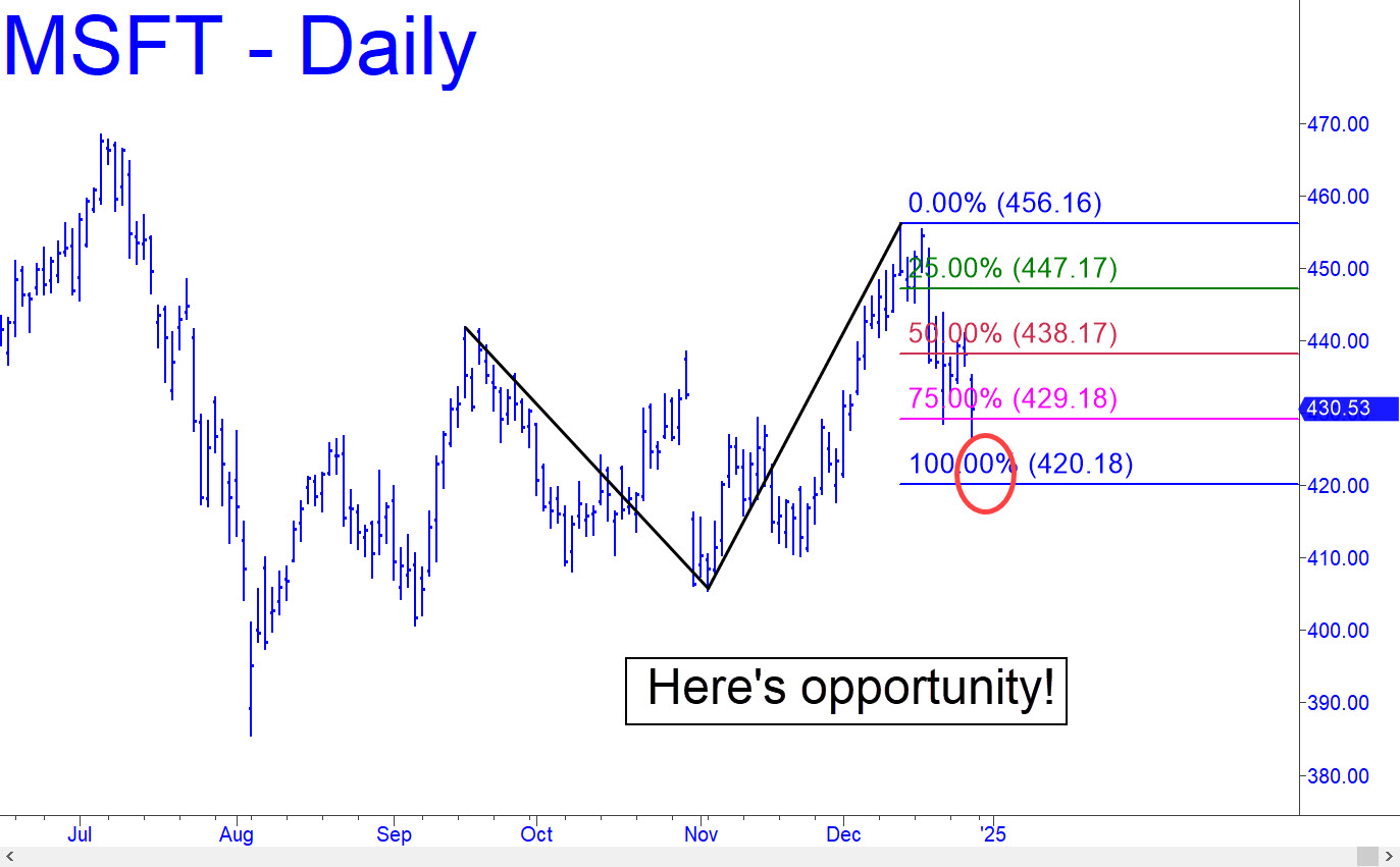 The daily chart yields a much clearer picture than the 30-minute displayed here last week. It yields a 420.18 ‘d’ target that can be used to bottom-fish the now three-week selloff with risk very tightly controlled. The downtrend did not demolish the midpoint Hidden Pivot support (p=438.17) on the way down, and that makes more weakness to d less than ironclad. However, it looks likely, and the gnarliness of the pattern suggests the turn from 420.18 would be sufficiently precise to allow for the tightest imaginable stop-loss. Please note that if MSFT is in a downtrend that has further to go, all U.S. stocks will be under similar pressure. _______ UPDATE (Jan 3, 10:56 a.m. EST): The trade was an easy winner using a reverse-pattern (rABC) to trigger, since the stock caught a nearly $6 bounce from 420.66. It eventually went lower, however, and is in the throes of a short-squeeze bounce off yesterday’s bombed-out low at 414.85. Despite the ferocity of today’s rally, I now expect the stock to fall to at least 409.05, and thence to 393.35. Plan on getting short with a tight stop if the bounce hits 430.07.