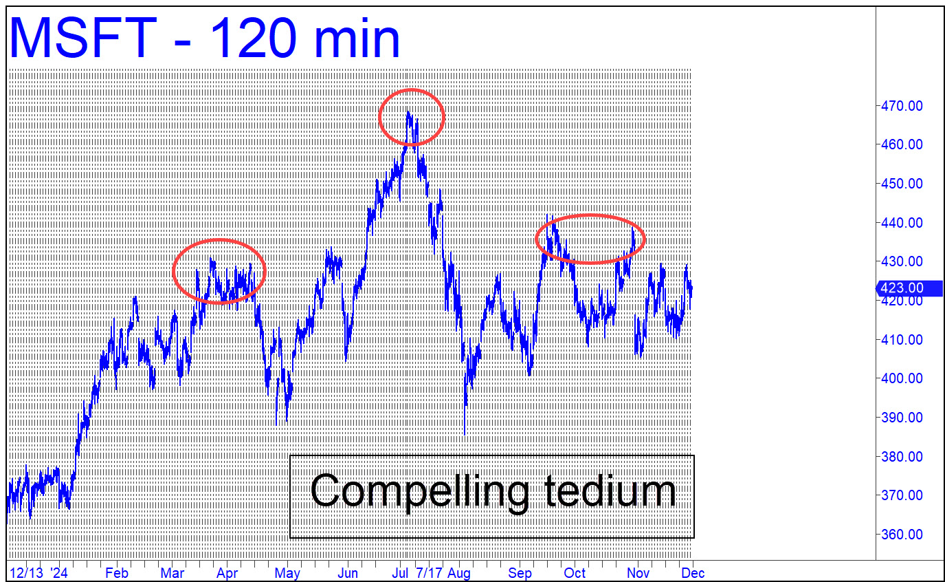 Continue to use the 435.90 target given here last week as a minimum upside objective and an optimal place to get short. A rally to that ‘reverse’ Hidden Pivot resistance would not affect the textbook perfection of a head-and-shoulders pattern that has been under construction since January. The pattern seems almost too pretty to work, but even if it doesn’t, I still expect 435.90 to provide an excellent opportunity to make money betting the ‘don’t’ line. Use put options at the 432 strike with three to ten days left on them. Be sure to check the chat room and your email ‘Notifications’ for updated guidance, however, since it might be necessary to modify the trade to obtain the best possible odds. ________ UPDATE (Dec 5, 1:10 p.m. EST): MSFT gapped through the 435.90 pivot on an opening-bar short-squeeze, but I still doubt it’s going much higher. There are two places you can look for a downturn, both of them voodoo numbers: 440.18 and 455.10. If the stock reaches the higher, it will trash the still-perfect head-and-shoulders pattern, but without negating the possibility of a major top forming well shy of the all-time high at 468.36 recorded in early July.