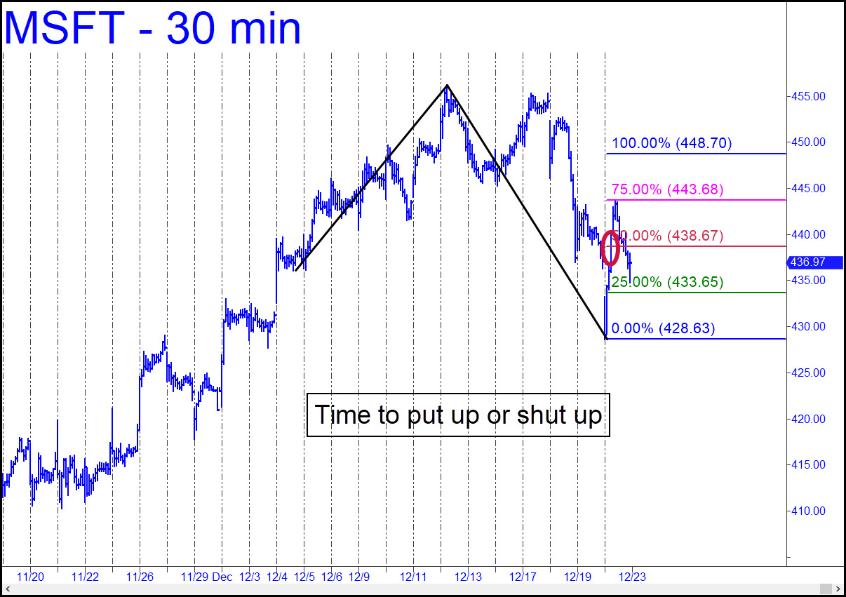 Microsoft would trigger a ‘mechanical’ buy if it falls to the green line (x=433.65), but I suggest paper-trading this one unless you are an expert because the point ‘a’ low is so nebulous. I rate the pattern a middling ‘6.5’ (out of 10). Even so, price action at p, even in lousy patterns, is usually useful for analyzing trend strength. In this case, the initial upthrust that impaled p was sufficiently decisive to imply that d=448.70 is entirely likely to be reached. Will the miserable pisher-of-an-‘a’ change the odds? We’re about to find out.