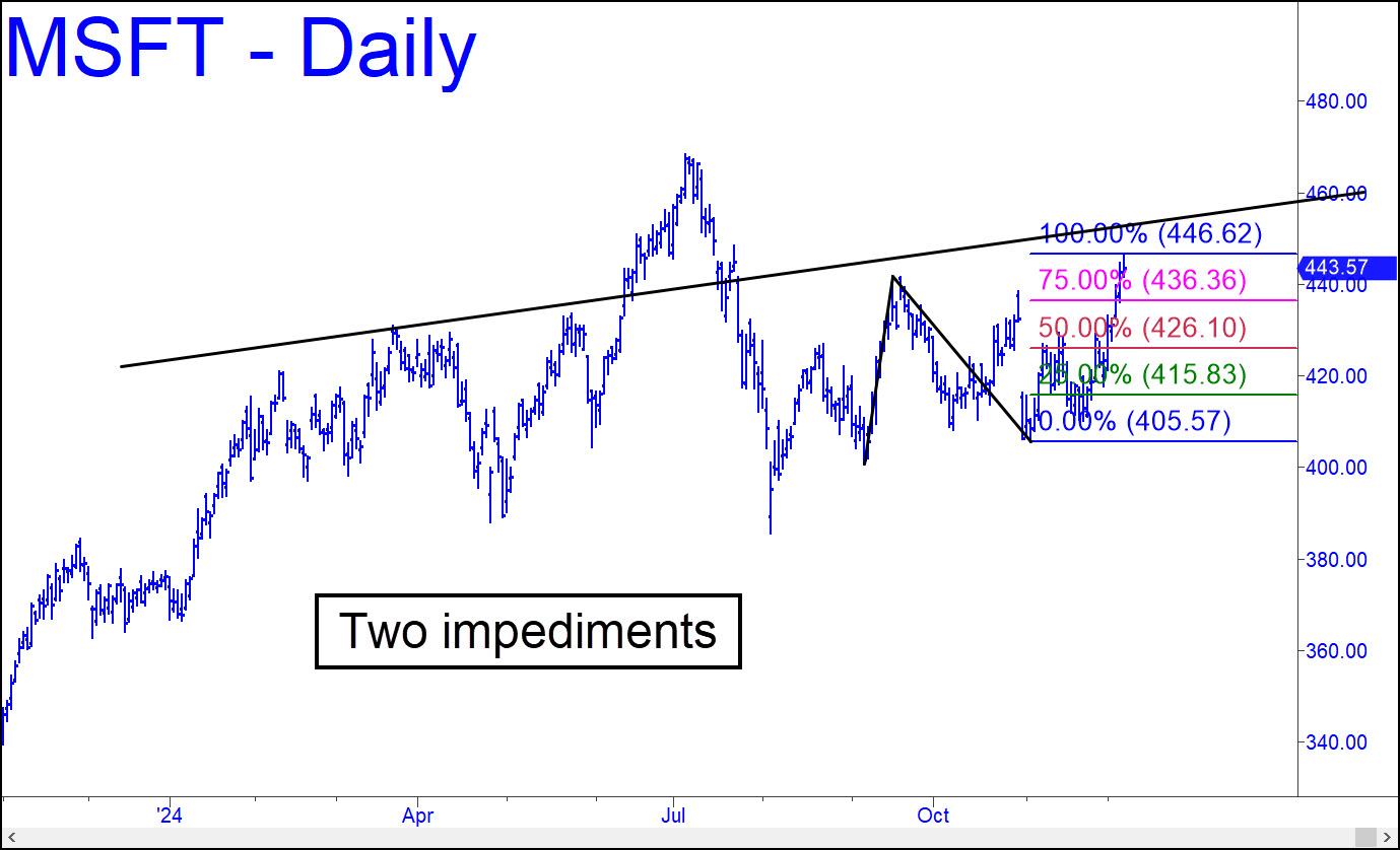 The chart shows two invisible impediments that could trip up bulls this week. The first lies at 446.62, the D target of a conventional pattern begun from 400 in early September. The second is a trendline resistance from a head-and-shoulders pattern that will come in around 455. Together, these potential rally-stoppers represent thick layers of supply between current levels and July’s record 468. The oddity is that until July MSFT had been leading the market higher. Is it about to resume that role after underperforming lunatic-sector stocks for the last several months? We should be ready for this possibility in any event, so stay tuned for updates in the days ahead. _______ UPDATE (December 12, 10:45 a.m.): A diabolically sick time for MSFT to be short-squeezing higher just when the lunatic sector is coughing and wheezing itself to death. One could almost believe the chimpanzees who purport to ‘manage’ money actually do meet in a smoke-filled room to plot each gratuitous, stupid sector rotation. If the stock hits 460, I’ll throw in the towel on that promising head-and-shoulders pattern that has perfectly defined and controlled the stock’s ups and downs for the entirety of 2024.
