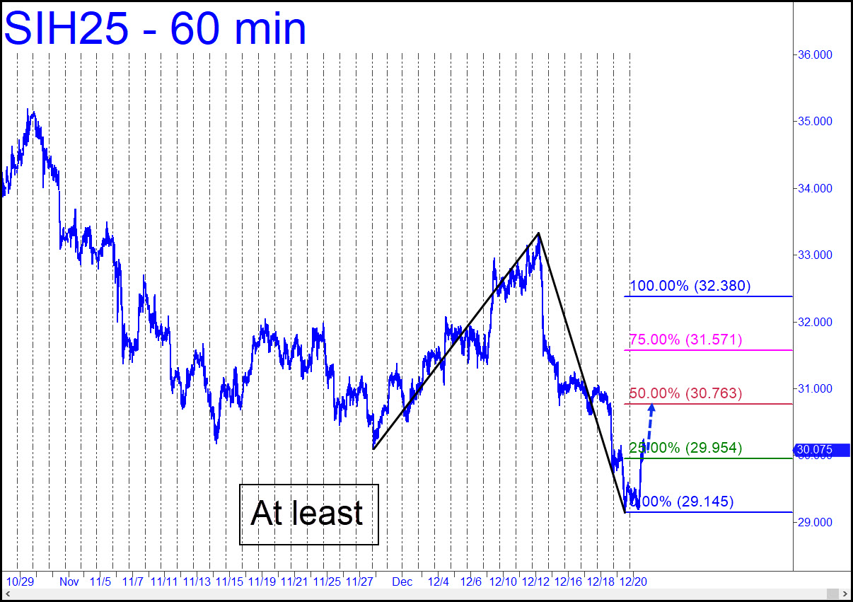 The March contract looked bound for at least p=30.763 when the music stopped on Friday. The pattern is sufficiently clear to keep us confidently on the right side of the trend and allow us to exploit it profitably with relatively little risk. Most immediately, that would imply getting short at p. The trade should be attempted only if you are comfortable using reverse-pattern triggers of small degree (aka ‘camouflage’). If the rally hits our sweet spot between p and p2 straightaway and then pulls back to the green line, that would offer a back-up-the-truck opportunity to bottom-fish ‘mechanically’.