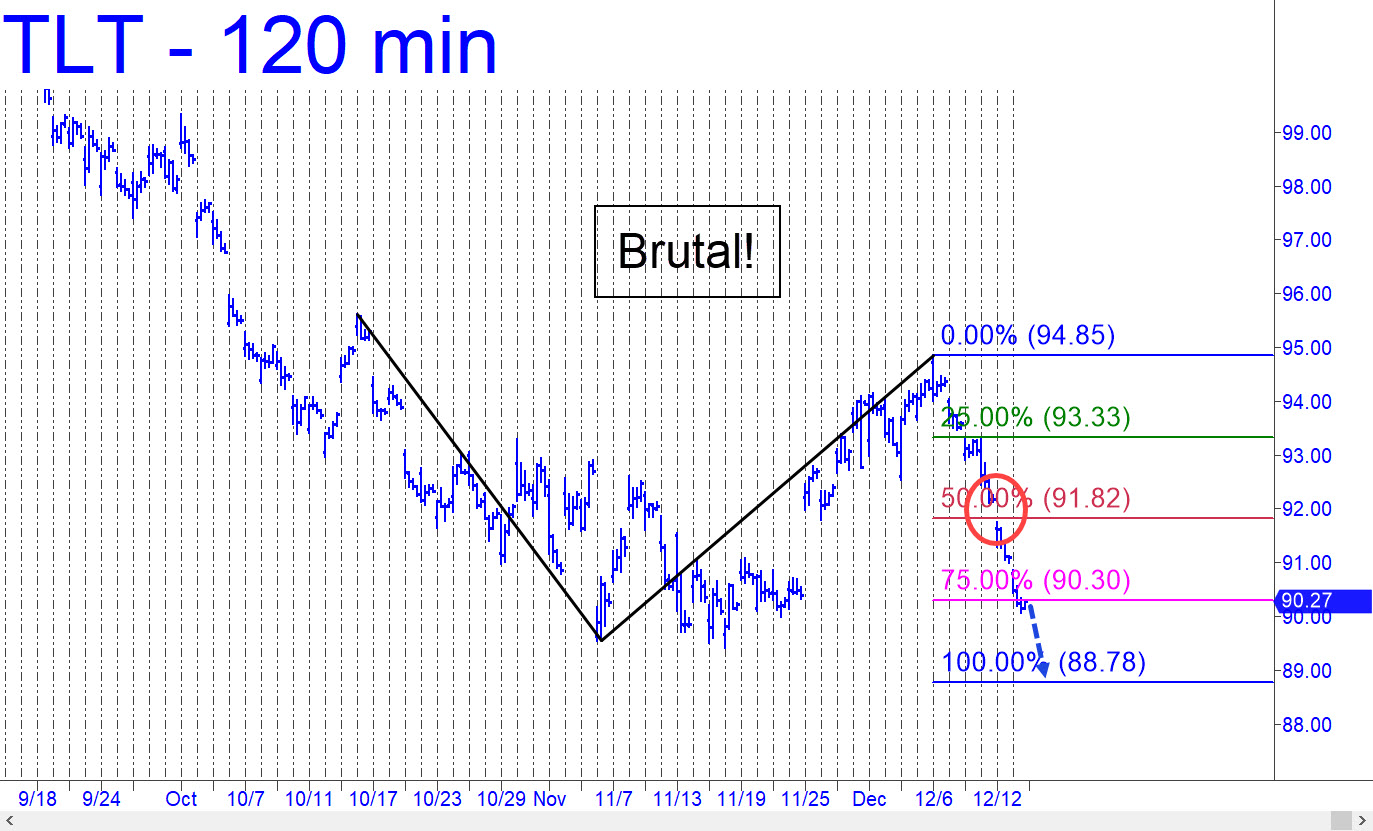 T-Bonds got crushed last week, reversing precipitously from within an inch of what would have been a bullish breakout. The gap down through p=91.82 all but guarantees the downtrend will continue to a minimum D=88.78, a Hidden Pivot support that can be bottom-fished by interpolating the target for March T-Bond futures. The reversal is likely to work precisely if at all, so you can use a stop-loss as tight as 3-4 ticks (or a ‘camo’ trigger) to get long. If the target is easily penetrated, that would be bad news for bonds and correspondingly bullish for interest rates. Higher rates would of course keep pressure on gold.