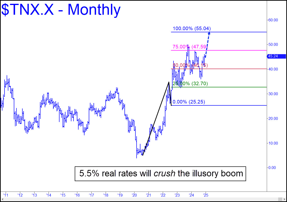 The chart shows interest rates on the Ten-Year Note rising over the next 8-12 months to 5.5% from a current 4.5%. This will devastate the economy and lay bare the delusion that America’s economy is booming. The 5.5% figure is deceptive, because, presumably, it will be achieved with asset values falling. If we repeat the experience of the Great Financial Crash of 2007-08, that would imply real rates (i.e., adjusted for deflation) rising to as high as 6%-10%. That would usher in an economic depression at a time when the U.S. economy is in much worse shape to weather adversity than in 1929. Back then, a third of the workforce was tied to the agricultural economy, literally living off the land. This time, perhaps 80% of the workforce is tied to bullshit. That figure is not invented, by the way; it is simply extrapolated from Musk’s firing 80% of Twitter’s employees without impairing the company’s ability to carry on normally.