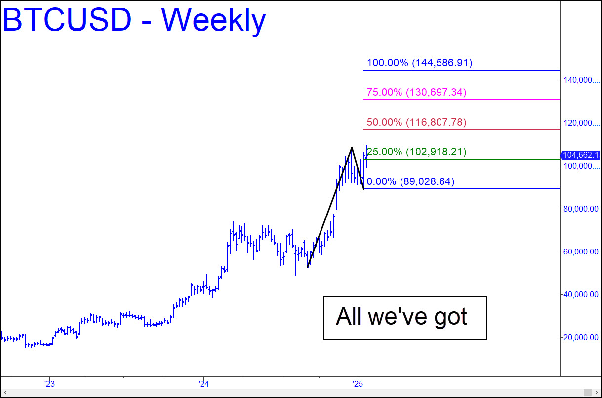 Although I hate to haul out a chart that shows a clear path to at least 116,807 for this gypsy-grade scam, it’s all I’ve got at the moment. The pattern is obvious enough to have attracted the attention of ten thousand clowns, so we shouldn’t expect the levels to work with the usual precision; however, they should be good enough for government work. With regard to the 144,586 target, I’ll reserve some skepticism until such time as BTCUSD blows a gaping hole in p=116,807, the midpoint Hidden Pivot. Regardless, you should plan on shorting there if you know how to set up a ‘camo’ trigger that limits risk to theoretical pocket change.