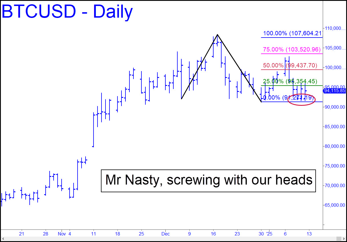 The paper-trade I’d suggested last week, a ‘mechanical’ long from 95,354, is still live, but I’m glad we didn’t take an authentic piece of it. Bitcoin spent four days threatening to trigger the stop-loss at 91,270, socking the position with a $4000 loss. I am still tracking it diligently because a failure to achieve the 107,604 would imply that Bitcoin, and therefore all cryptocurrencies, have made their bull market top. It got some lift off Friday’s low, but not quite enough to waft it beyond danger. It’s hard not to notice the clean look of the head-and-shoulders pattern that has been forming since mid-December. Symmetry would put the right-shoulder collapse somewhere toward the end of the week or early next.