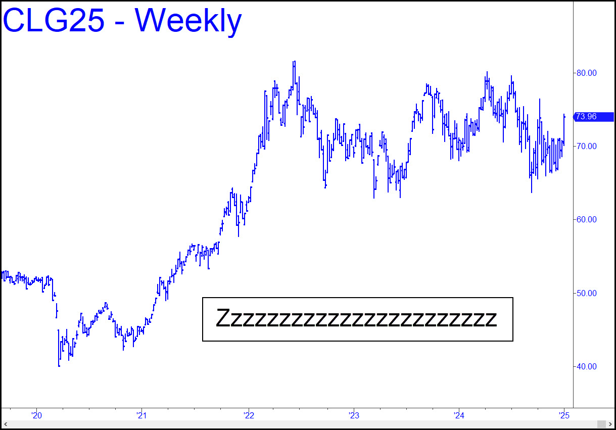 My coverage of crude will remain perfunctory, since paying closer attention might induce coma. Its gratuitous ups and downs over the last three years have been worse than merely screwing the pooch. The head-fakes, foot-fakes and other annoyances are especially difficult to trade, and even voodoo numbers don’t seem to work. Although the sonofabitch cannot outsmart us when we observe its stupid little tricks on a 5-minute chart, it’s simply not worth the effort to stalk them. No one has mentioned crude in the chat room in months — not even Artie — but I will continue to answer your trading-related questions as always.