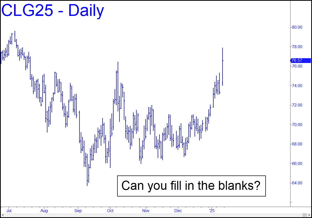 The futures narrowly missed triggering a conventional short at 75.26 after Friday’s powerful rally. The trade remains viable, but it should be attempted only by traders who can limit entry risk to perhaps 10% of the implied risk of 2.61 points per contract. The trade triggered via a voodoo number whose location will remain a proprietary secret. The chart shown is generic, but I’ll mention that half of the position should be covered at 72.6 if your order fills. If you can retro-engineer the chart pattern, you are qualified to trade this one.