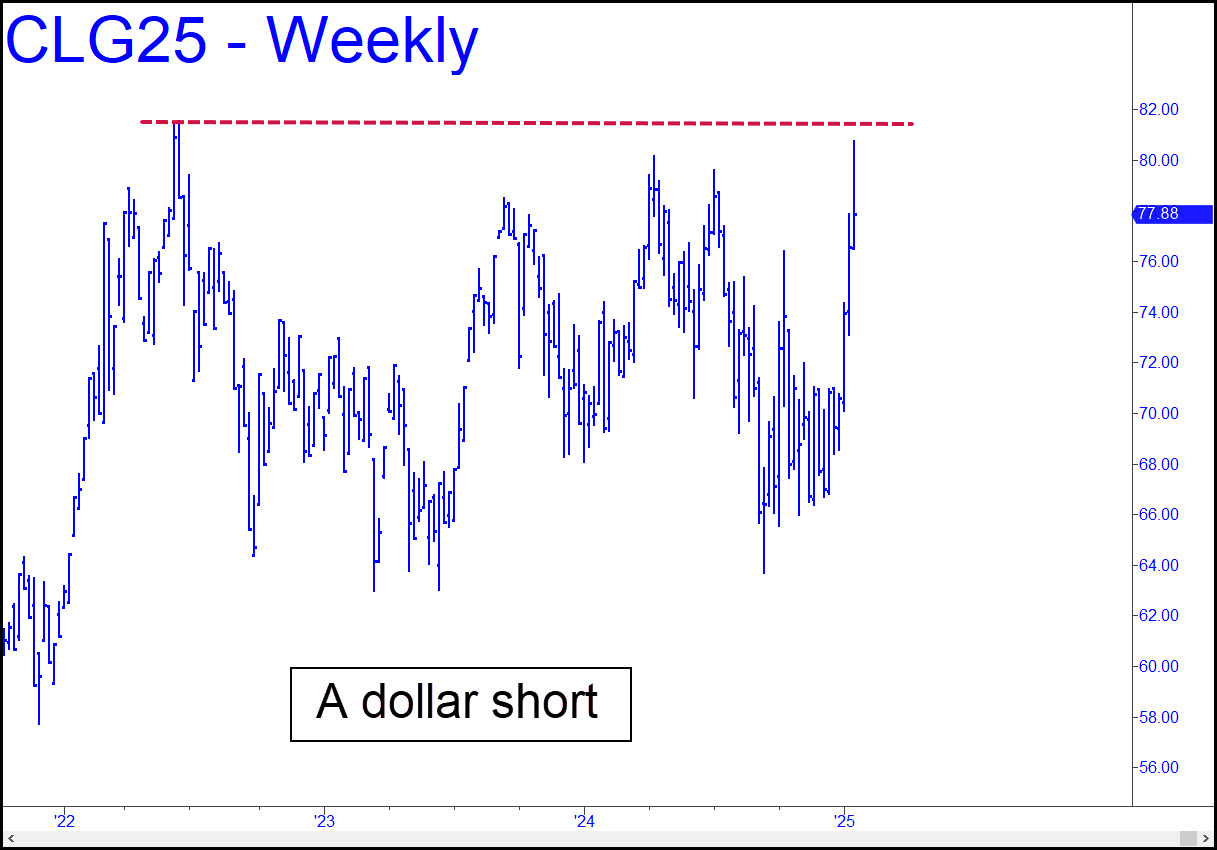 We’ve come to expect crude’s rallies to go nowhere, implying they will tend to reverse before breaking out. This one came close, though, before it smacked into a voodoo number that sent it reeling. The reversal occurred just a hair short of the watershed top at 81.53 recorded in June 2022. The long-term picture remains bullish nonetheless, and it’s only a matter of when, not if, crude pushes above 81.53. So why have quotes held stubbornly above $65 for the last three years? Because it’s a dangerous world, would be my guess.