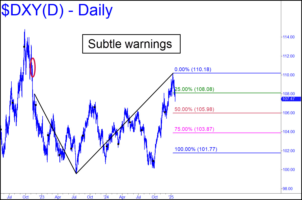 I shrugged off a remark in the chat room that the Dollar Index did not exactly follow my bullish script last week. I noted at the time that the long-term trend is unambiguously bullish, and that the rally from October’s low has been nothing short of spectacular. However, when I looked very closely at the chart while preparing this tout, there were some subtle signs of possible trouble. For one, the most recent rally peak failed to surpass any external peaks. I’ve circled the closest on the chart, a look-to-the-lefter so subtle that it is not even visible in the SnagIt reproduction. Nevertheless, a basic rule of my system is that healthy rallies must exceed at least one prior peak with each upthrust, and this one didn’t. Also, notice that the selloff from last week’s 110.18 high triggered a theoretical ‘sell’ signal when it breached the green line (x=108.08). We should take this seriously because the reverse pattern itself, although highly unorthodox, comprises three ‘locked’ coordinates whose authority cannot be denied. The implication is that DXY may have begun a fall that could take it all the way down to 101.77. If so, that would be quite bullish for gold.