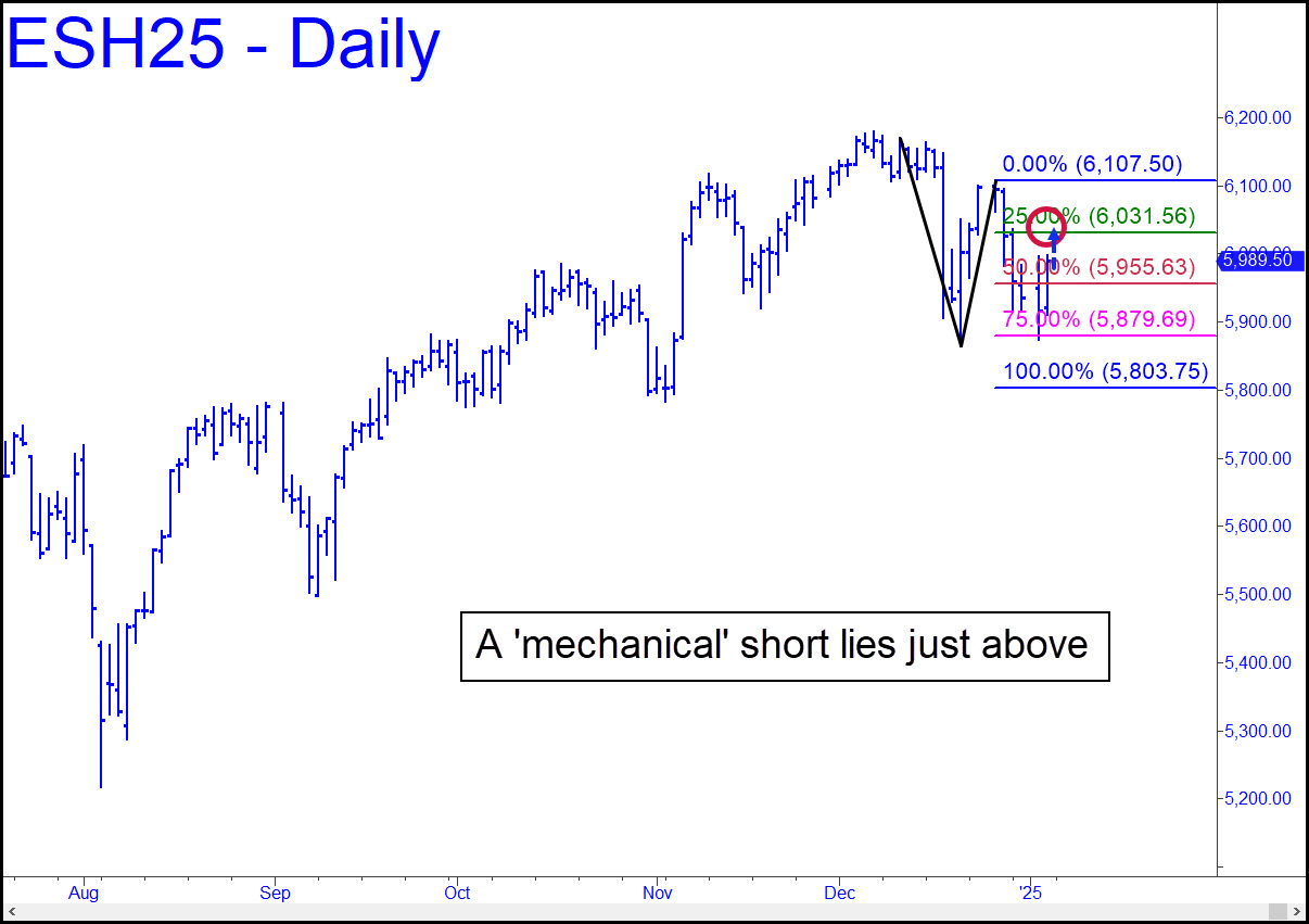 If the so-far moderate short squeeze off Thursday’s 5874 low touches the green line (x=6031.56), it would trigger an enticing ‘mechanical’ short, stop 6107.75. Since this would follow a record high in early December at a major Hidden Pivot resistance, we may soon have more evidence that a long overdue bear market has begun. Paper-trade this one unless you are adept at using ‘camouflage’ triggers to shrink entry risk. A relapse to the D target at 5803.75 would not be impulsive, although it would follow an A-B leg that was, unmistakably. ______ UPDATE (Jan 6, 9:34 a.m. EST): The short triggered at 6033.25 and produced a theoretical gain moments later of 8 points ($400) per contract. The trade is still live, with two contracts covered at p=6025.25, and two remaining to be covered at d=6009.50 (15m, a=5965.75 on January 3 at 9:45 a.m.). The stop-loss would be at your discretion now.