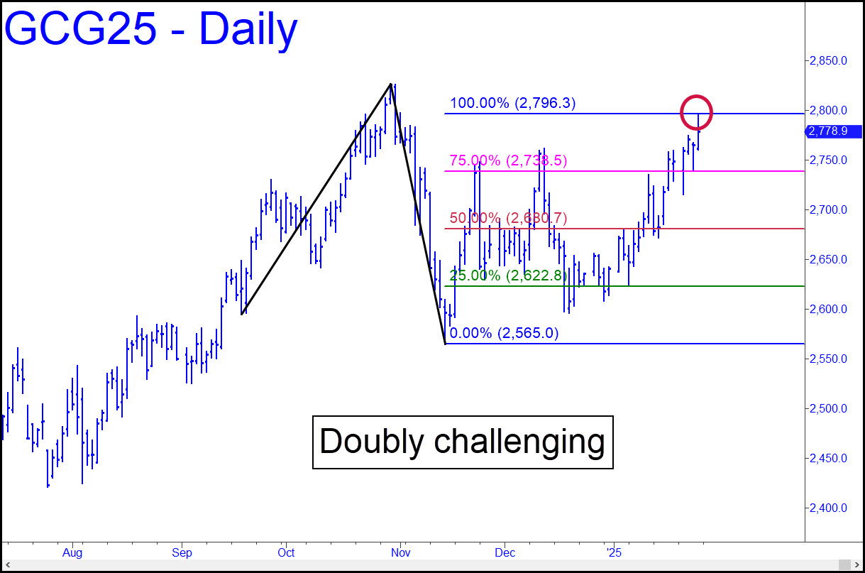 Careful! Feb Gold topped Friday at a double resistance of daily-chart degree. One of the impediments is shown in the chart: the ‘d’ target of a reverse pattern dating back to September. The second was a voodoo number that came even closer to nailing the actual high at 2794.80. Taken together, these ‘hidden’ obstacles made shorting the top relatively easy. The 19-point reaction move was worth as much as $7600 to any subscriber who took my 9:34 post in the chat room seriously enough to squeeze off a trade. Of course, if the futures push past this double-trouble spot effortlessly next week, it would be a very bullish sign, leaving gold on track for a move to at least 2865.90 (A= 2525.40 on Sep 4). ______ UPDATE (Jan 30, 1:08 p.m.): February Gold’s fist-pump this morning through the red line, a ‘midpoint Hidden Pivot resistance’, has cleared a path to $3018, 7% above the current $2822. (That equates to $3041, basis the April contract.) Bullion’s dramatic burst of strength is being attributed to various factors, including Trump’s threat of tariff restrictions and safe-haven demand, but that is like saying the moon has been affecting the tides. Far more likely is that gold has caught a whiff of Big Trouble ahead that we can only guess about. I am already on record as saying stocks have topped, even if Bitcoin has yet one or two more lunatic upthrusts in it to set the hook for the most egregious speculators. The Indoos and the S&Ps may notch marginal new highs as well, but they would occur in the context of a choppy top that does significantly exceed recent peaks.