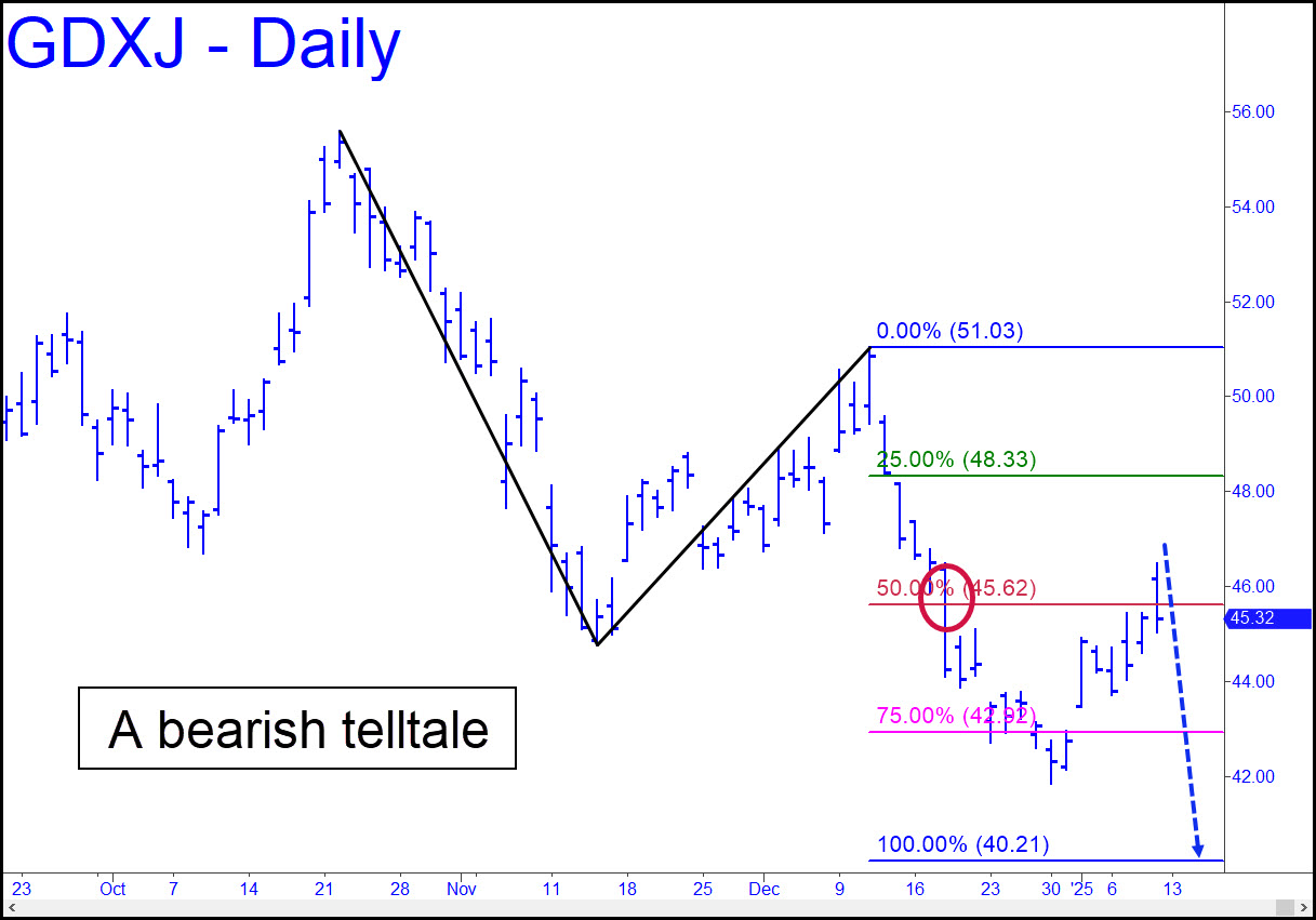 The rally could go a little higher, but it would likely be corrective. The initial downside penetration of p=45.62 in December was sufficiently decisive to imply that GDXJ will eventually fall to D=40.21. In fact, the breach was brutal enough to warrant trying a ‘mechanical’ short from the red line. If so, it would take a stop-loss at 47.42. That trade has already triggered and is slightly profitable, so I’ll suggest enjoying it from the sidelines.