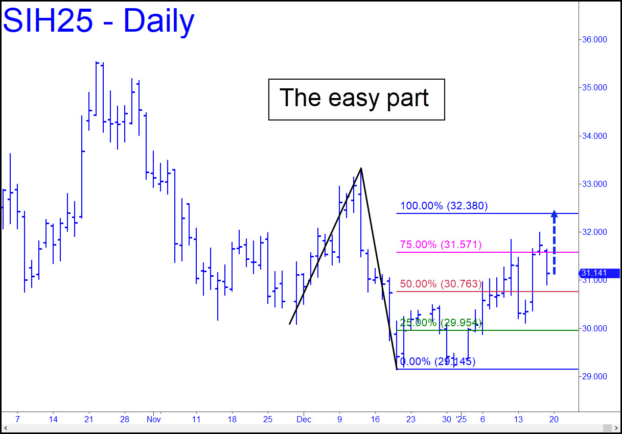 I’ve used a 32.380 target for the March futures since before Christmas. Expect a tradable stall there, but if buyers blow past this Hidden Pivot resistance, my minimum projection will rise to 32.715 and thence to 36.285. My long-term projection for a bull-market top is 53.06. That target is tied to a crucial ‘midpoint Hidden Pivot’ resistance at 32.350 that has yet to be exceeded in this