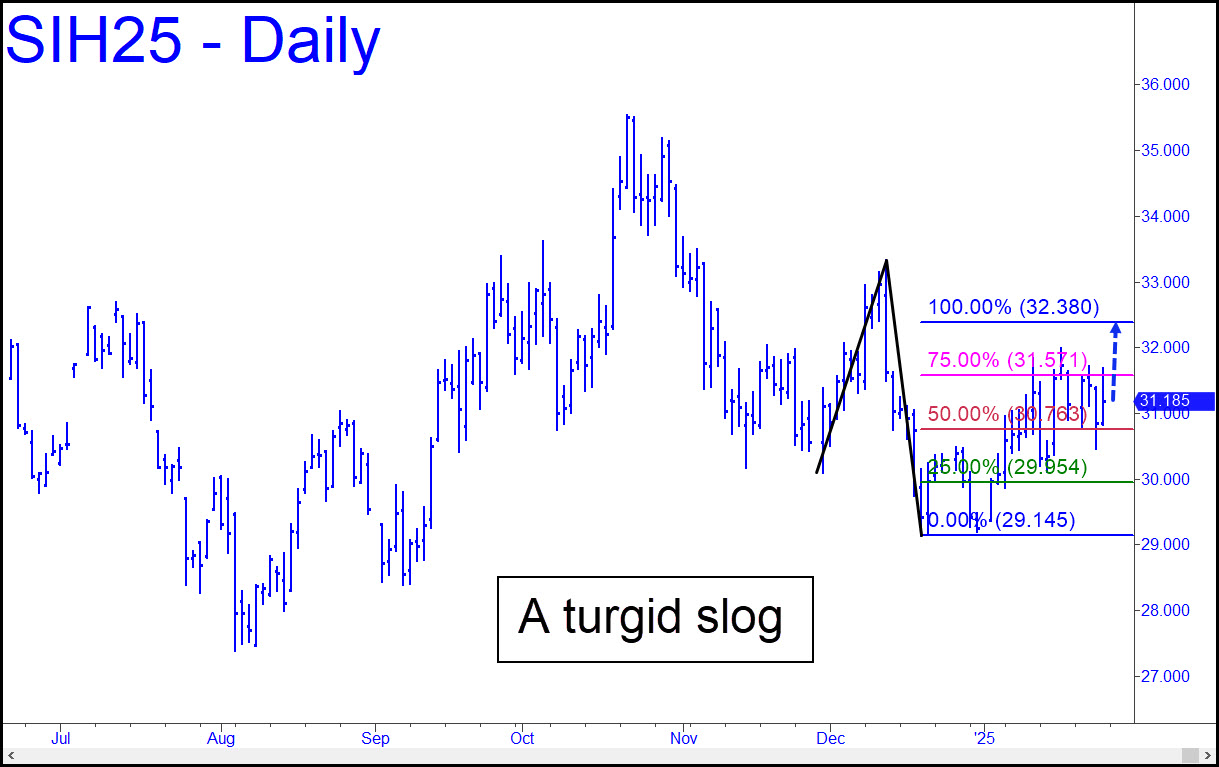 The March contract first signaled a move to d=32.38 more than a month ago, on December 20. It has been a brutal slog since, lacking the brio we’ve seen lately in gold. Even so, it’s difficult to imagine the futures not getting there, probably early in the week. A decisive pop through the Hidden Pivot would mitigate the sluggish feel of the chart, setting silver up for a less labored push toward December 12’s 33.33 peak, and thence to the towering external peak at 35.53 recorded on October 22.