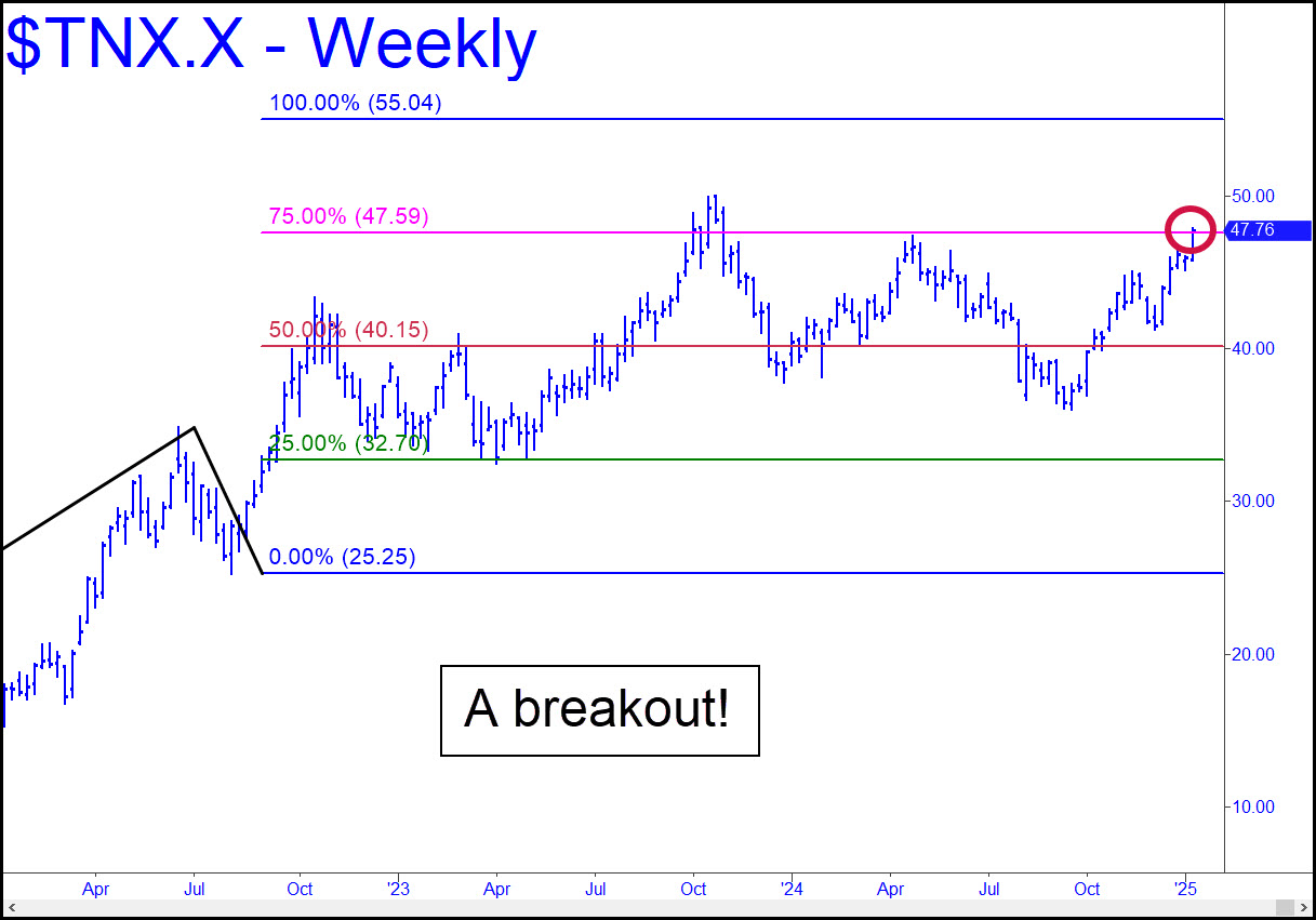 Last week’s spike surpassed an important peak at 4.74% recorded last April. On its way to a presumptive high at 5.55%, the rally will face additional resistance at 4.87%, a ‘voodoo number’: and at the 4.99% peak notched in October 2023. If these invisible impediments do not put up a fight, it will increase the likelihood that the 5.50% target will be achieved. The two years TNX spent head-butting the midpoint resistance at 4.01%, then trying to break free of its gravitational pull imply there’s a chance the rise in rates will abate somewhere close to the 5.13% midpoint between p2 (47.59) and D. ______ UPDATE (Jan 18): Rates on the 10-Year have rolled down from somewhat below the 4.87% voodoo number, but I’m not ready to infer the uptrend is weakening. Let’s see if this presumptive minor correction can catch a bounce from this pattern‘s 45.22 ‘D’ target.