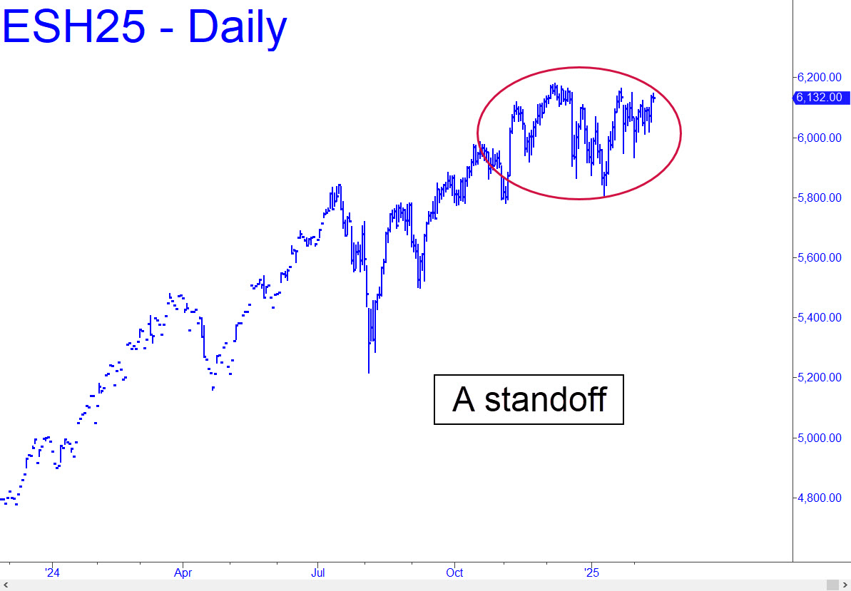 Bulls and bears have been in a tug-of-war since November that has looked more like accumulation than distribution. However, the failure of the S&Ps to break out to new record highs last week when exuberance over Trump’s election was feverish implies stocks may need to sell off hard to get running room for the next big upthrust, assuming one is coming. I expect the implied correction to bring the March contract down to at least 5863.75 (daily, a=6107.50 on 12/26) before the futures find good traction..