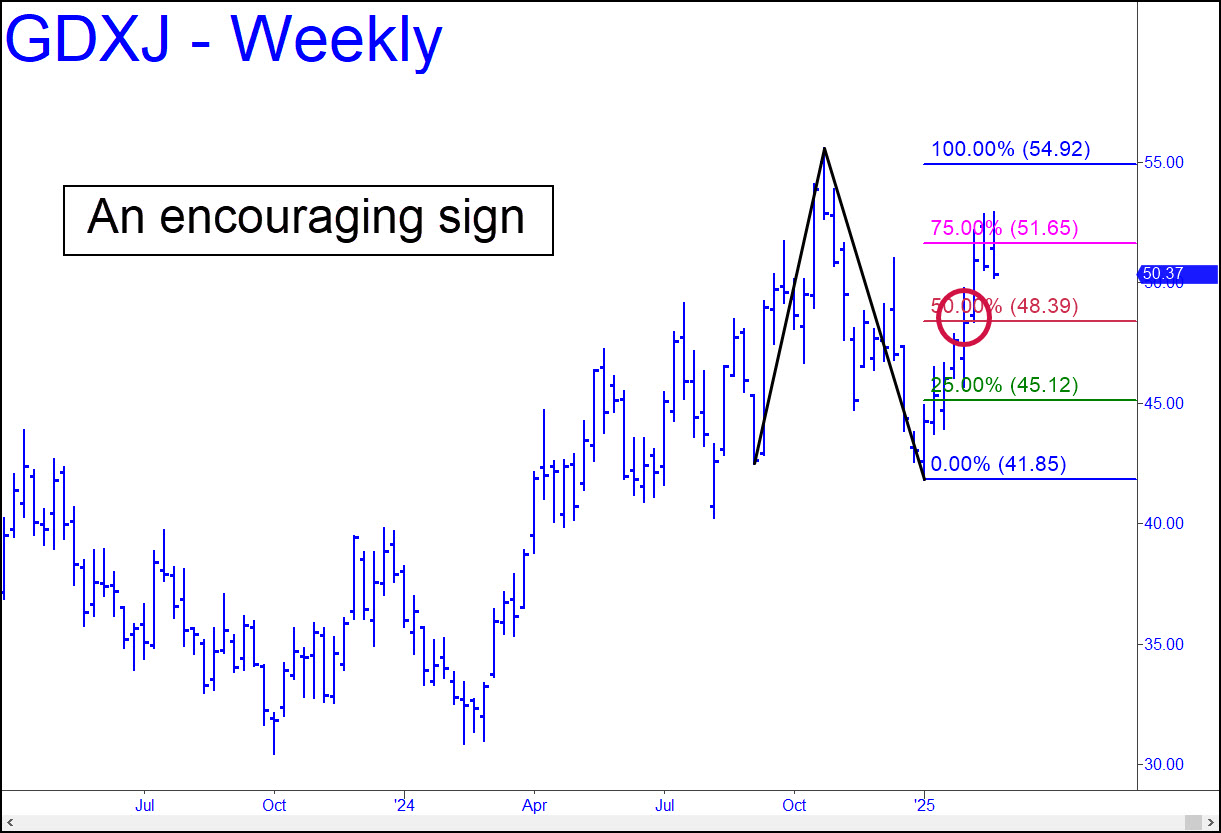 GDXJ’s easy thrust through 48.39, a midpoint Hidden Pivot resistance, implies a strong likelihood that the rally will reach 54.92, a bull-market target of middling importance. The pattern also suggests that a pullback to 48.39 should be bought with a stop-loss at 46.21. If you know how, you should use a ‘camouflage’ trigger to cut the initial risk by as much as 95%. That would entail creating an entry trigger with an ABCD pattern extrapolated from the 15-minute chart or less.