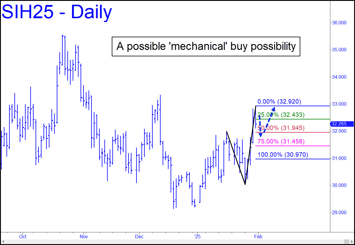 Silver’s ascent last week was not as impressive as gold’s, creating a minor divergence that seems likely to continue, at least for a short while. However, the March contract would trigger a mechanical buy if it falls to p=31.945 when trading resumes Sunday afternoon. Using a reverse-pattern trigger, risk no more than 1,50 cents on the entry, but be prepared for more slippage to d=30.970 if the trade fails. If this pullback exceeds ‘d’, it would imply silver will pull gold down rather than the other way around.