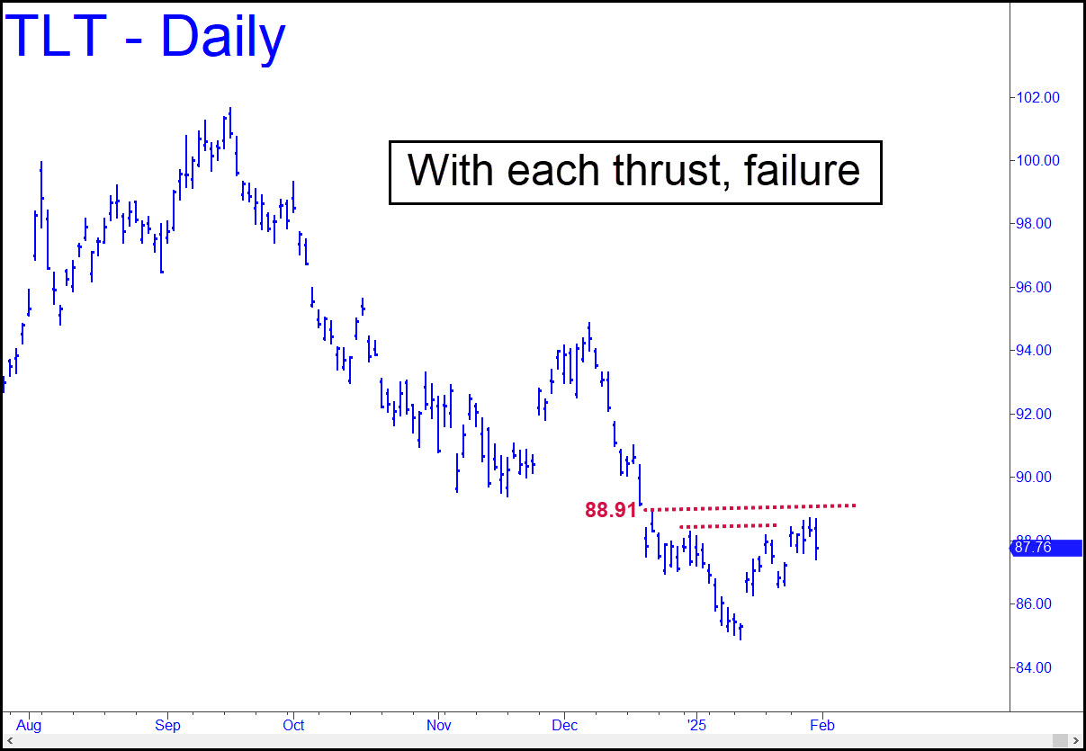 The rally from mid-January’s low may seem impressive, but don’t expect much to come of it. The ascent has occurred in two discrete upthrusts, neither of which exceeded an external peak. The failure to do so was a matter of inches, but that’s all the more telling since it demonstrated that bulls manifestly lack the vigor and conviction to generate impulse legs on the daily chart, let alone effortless ones. I’ll remain skeptical until such time as TLT pops decisively above the 88.91 peak notched on December 20, then stays above it for two consecutive days. _______ UPDATE (Feb 5, 10:19 p.m. EST): I’ve been fighting off every bullish sign, but there is no denying the bullish implications of today’s breakaway gap through a clear Hidden Pivot target at 89.81. Buyers will need to do a little better, pushing past the 90.99 ‘external’ peak recorded on December 17, to demonstrate their new prowess, but that shouldn’t be a problem given the power of today’s move.