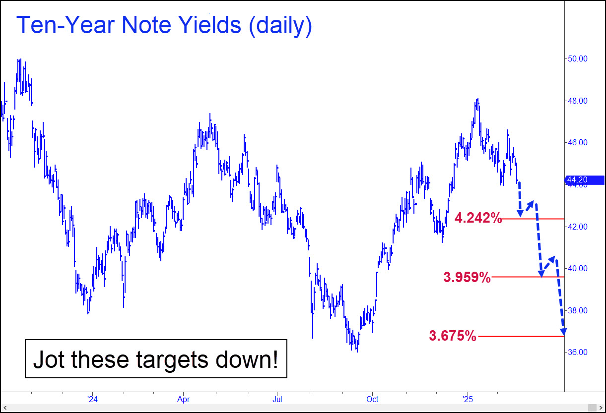 Ten-Year yields have been pounding on a ‘hidden’ support at 4.430% for more than two weeks, presumably getting ready for a drop to exactly 4.242%. A tradable rally from that Hidden Pivot support looks like an 80% bet, but if it eventually gives way, look for a further fall to 3.959% or even 3.675%. By all means, jot these numbers down if you care about where long-term interest rates are headed, since charts can predict them far more accurately than the dartboard guesses you’ll get from Bloomberg’s talking heads, The Economist, The Wall Street Journal, the punditry, Fox Business News, MSNBC et al.