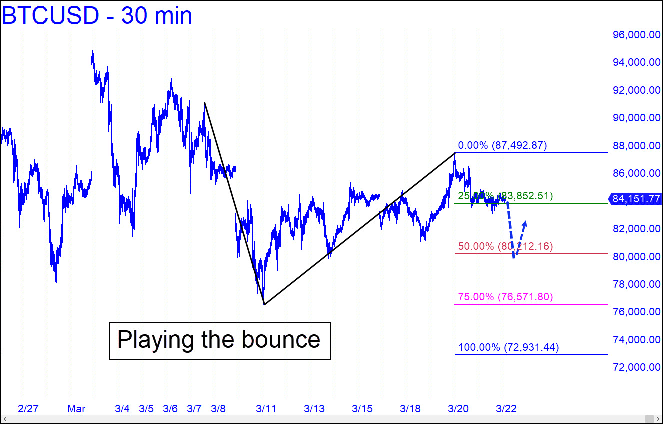 Bitcoin has gone nowhere since I predicted a fall to at least 68,233, or possibly 54,848. I’m going to substitute a less dramatic scenario, since I expect this symbol to rally along with the broad averages in the weeks ahead. Accordingly, you can use the 80,212 midpoint Hidden Pivot support shown in the chart as a worst-case downside target for the new week. It can be bottom-fished aggressively with a stop-loss at 79,890.