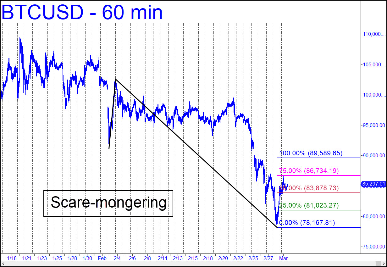 Bitcoin’s wild histrionics never stop demonstrating that the most crazed trading vehicles are the easiest to forecast. Friday’s bounce following a cliff-dive splash occurred precisely at a ‘voodoo’ support that I was too busy to notice at the time. If you want to play catch-up, jump on this lamb chop on a fall to 81,023, the green line. The trade would require a 78,166 stop-loss. You can also get short at 89,589, provided you have a way to cut the theoretical risk down to relative pocket change. My earlier comments anticipated further slippage into the 60s, but first let’s see if the headless chickens who animate this vehicle can pop it through my Hidden Pivot resistance at 89,589. _______ UPDATE (Feb 7, 9:57 a.m.): Bitcoin has been preparing for the next plunge to 70,000 or lower with gratuitously violent swings. They are engineered to help the so-called smart money distribute inventory to the rubes and crazed young people. if a rally gets close to 96,430.27, an interesting Hidden Pivot resistance, I’ll recommend shorting there with a stop-loss no wider than 96,976.01.