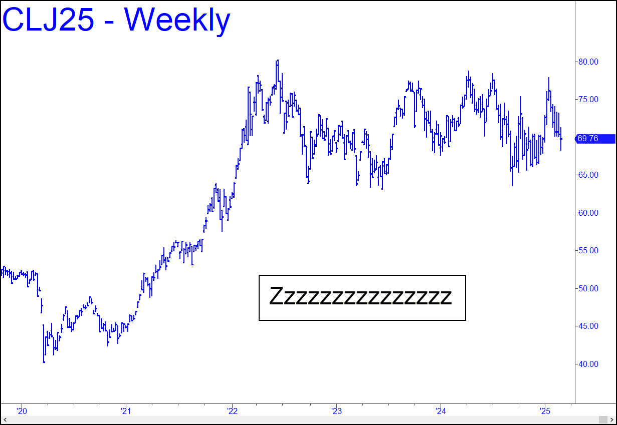 I’ve updated the marquee only because April is now the active month. My outlook for the near and intermediate term, however, remains virtually unchanged: Zzzzzzzzzzzzzzzzzz. What an ill-behaved bore crude is, even though it is the largest, most heavily rigged commodity market on Earth — in the Milky Way galaxy, for all we know. The April futures are currently trading just beneath the middle of a gratuitous $15 range that has obtained for more than three years, fixing to do…whatever. Remember: I’m always available in real-time to vet your oil-trading ideas, even if this tout is just a placeholder.