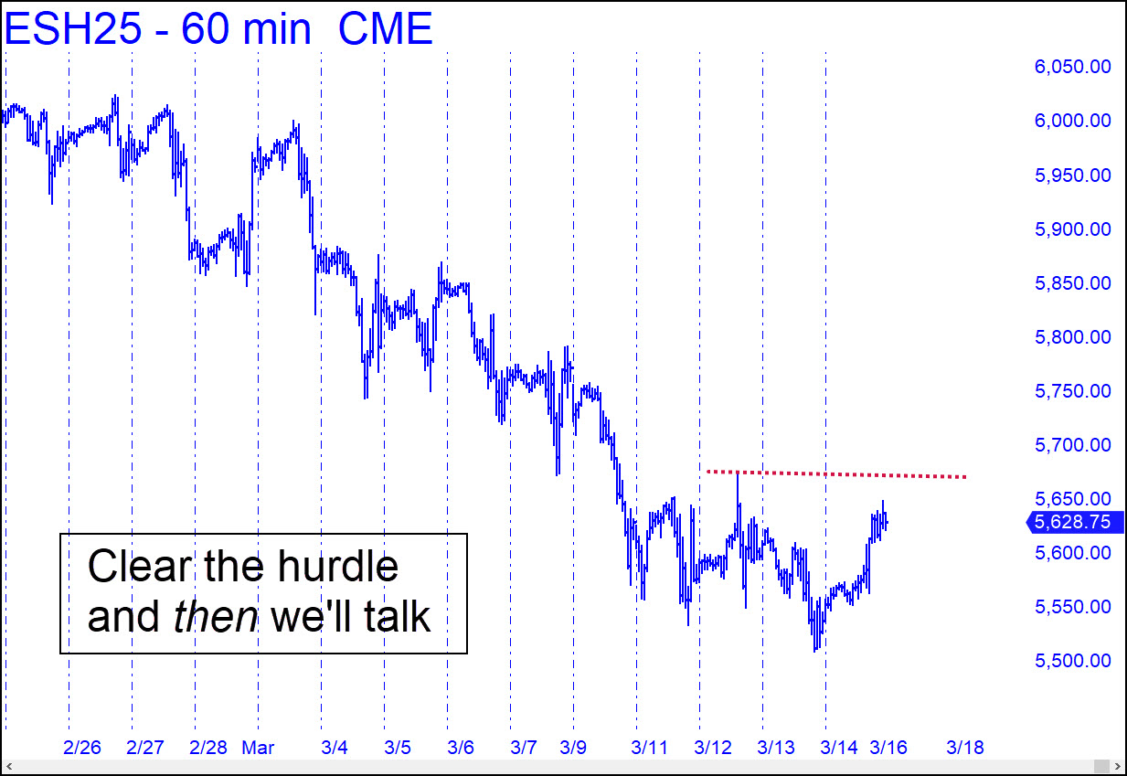 Friday’s 101-point thrust came within less than a point of fulfilling the 5649.50 target I’d flagged in the chat room an hour before the day began. I’d said it would take much more than that to produce a bear rally worthy of the name. How much more? Probably another 300 points before bears who have bet the ‘don’t’ line would start feeling queasy. The sassy little pisher that capped the week didn’t surpass a single distinctive peak. Still, that’s how all memorable bear rallies begin, greeted with skepticism the moment they bolt from the gate. Let’s see if short-covering bears have the energy to lift this brick above 3/12’s 5675.00 peak as the new week begins. Expect this to happen earlier in the session if at all, since that is when the sleazeball who control the game have the most control over the order book. _______ UPDATE (Mar 17, 12:53 p.m. EDT): The June contract’s timid rally this morning just missed taking out a peak at 5726.75 equivalent to the one given above for the March futures. It will do so shortly, however, and will then face a more challenging and less obvious resistance at exactly 5740.25. That is the midpoint Hidden Pivot resistance of this pattern, which allows a bear rally to as high as 5920.50, a back-up-the-truck number for getting short. You can try shorting 5740.25 as well, provided you can handle a ‘camo’ trigger on the lesser charts. Risk no more than 3.50 points on the initial stop-loss.