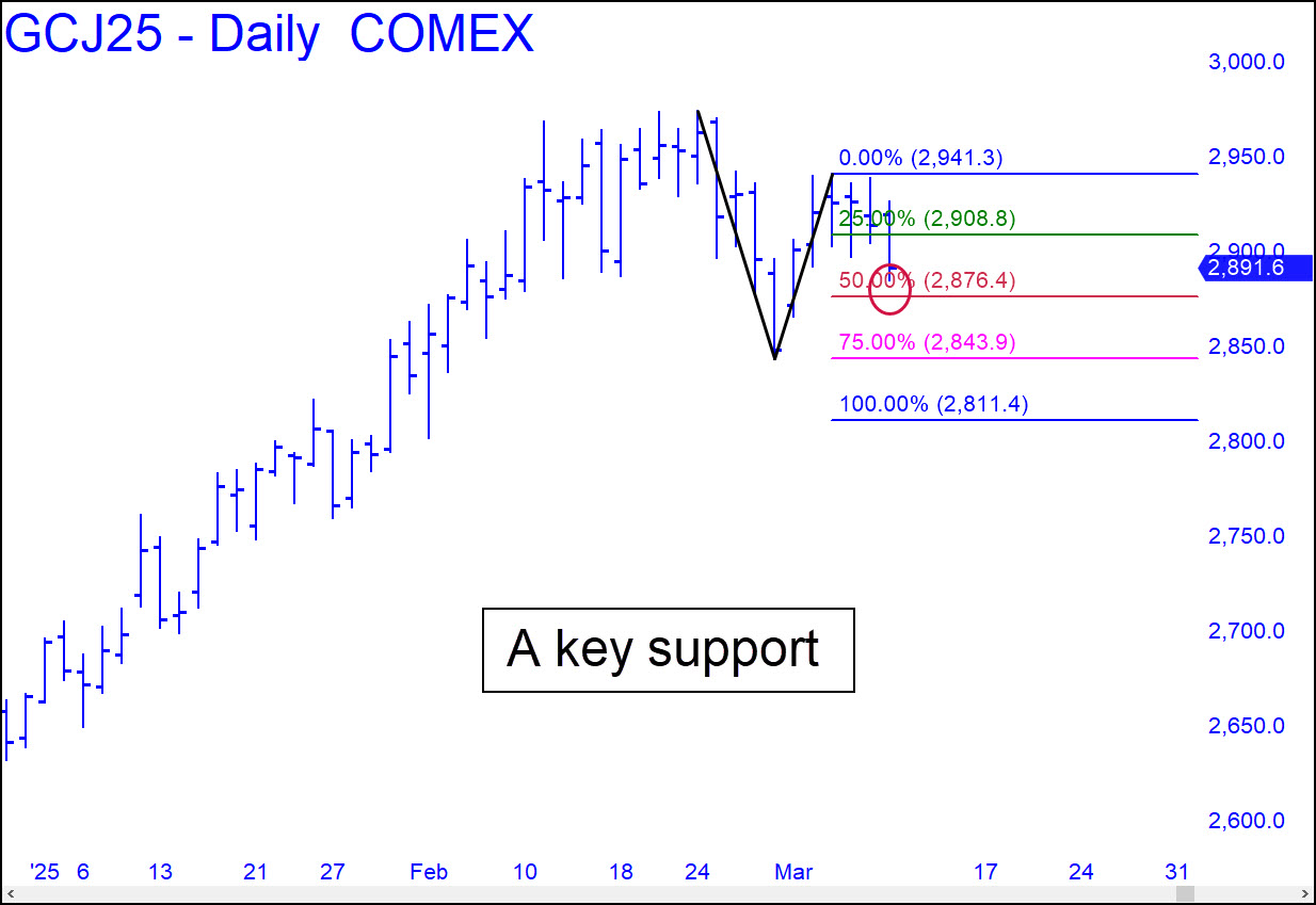 I don’t usually discard the old tout when I update during the week, but this time I’ll make an exception for the sake of clarity. The original tout was wishy-washy bullish, but the new one keys off a chart with no wiggle room. The April contract appears certain to fall to the 2876.40 midpoint Hidden Pivot support. That will be an opportune spot to try bottom-fishing with the tightest stop-loss you can construct. (It should be no wider than 2872.40 in any case.) However, if it doesn’t hold, and especially if the futures close for two consecutive days below it or trade lower than 2862, expect more slippage to D=2811.40. The obviousness of the pattern will work against its providing perfectly precise reversal points, but they should be good enough for government work because the pattern, with a very kosher A-B impulse leg, is so compelling. ______ UPDATE (Mar 12, 4:42 p.m.): April Gold has rallied robustly over the last two days, but I doubt that it is about to take out the old high at 2974.00 straightaway. A ‘voodoo’ resistance at 2961.50 could test this theory, but if the futures relapse instead, look for the selling to hit 2884.00, at least. That is the midpoint Hidden Pivot support of a conventional pattern drawn from the top, with a D target at 2819.00.