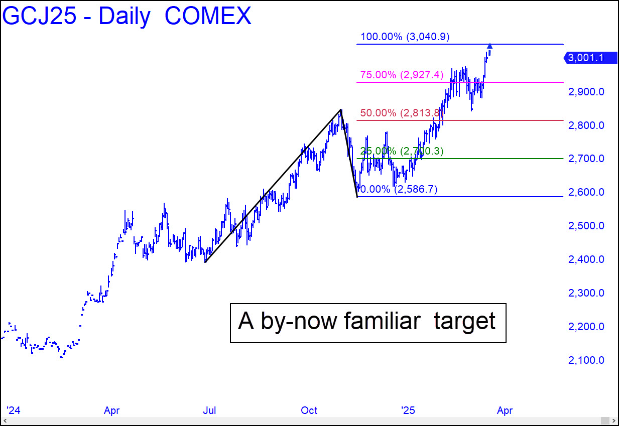 Once again, we return to a familiar target at 3040.90 that has kept us on the right side of the trend since late 2024, when there were nagging doubts. I could have done with a little more consolidation before the April contract broke out of a fraught range last week, but I don’t have much control over such things; I only try to see them coming. The daily chart suggests possible success bottom-fishing a moderate pullback to 2958.30 as the week begins. I put out a target last week at 3230 that came from a ‘blended’ monthly chart, but let’s upgrade that to the 3533.90 target shown. A stall precisely at p=3037.70 would help validate the pattern. It would also set up a promising ‘mechanical’ buy on a pullback to x=2789.60 once the futures have reached the sweet spot between p and p2.