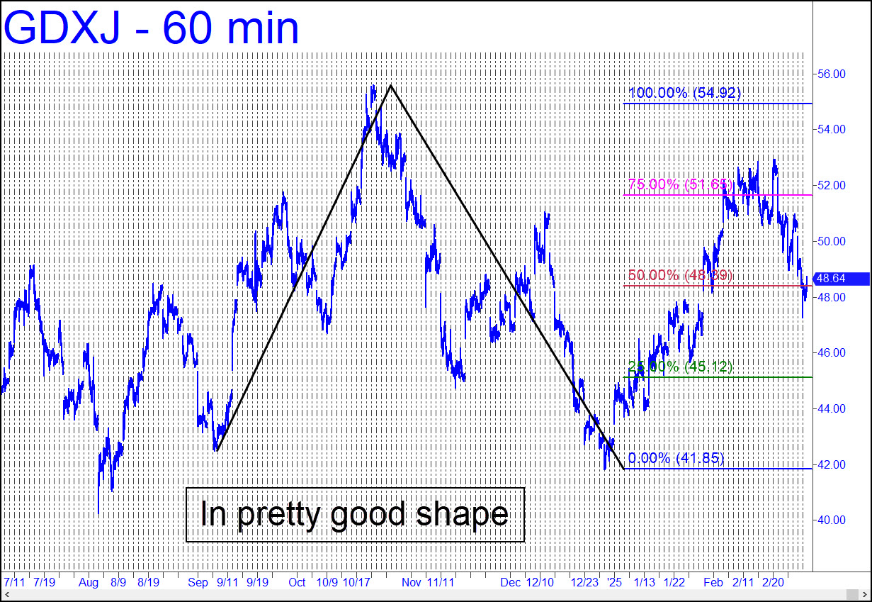 GDXJ’s chart is in good shape — good enough, actually, to hint that the upcoming test of support in gold and silver futures will favor bulls. The likelihood of this will increase if this vehicle hits the green line just as its Comex-contract cousins are touching their respective ‘D’ correction targets. Regardless, if GDXJ falls to x=45.12, shown in that inset chart as a green line, that would signal a ‘mechanical’ buy, stop 41.84. Presumably, it would be good for an easy ride back up to at least p = 48.39.