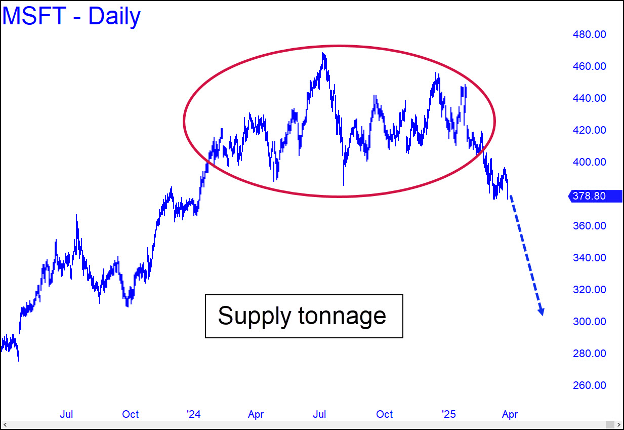 Microsoft sat poised on a high ledge when the dust settled on Friday. Although the visually unavoidable plunge the chart displays so well could wait for a few weeks or longer, it’s highly unlikely the stock’s institutional sponsors will be able to hoist it to the $420 midpoint of the supply zone, never mind to new record highs. The alternative is a wealth-destroying slide into the low $300s that should bring a bounty of opportunity for the nimble, since it will be reflexively punctuated by rallies designed to keep hope alive until a bottom is reached.