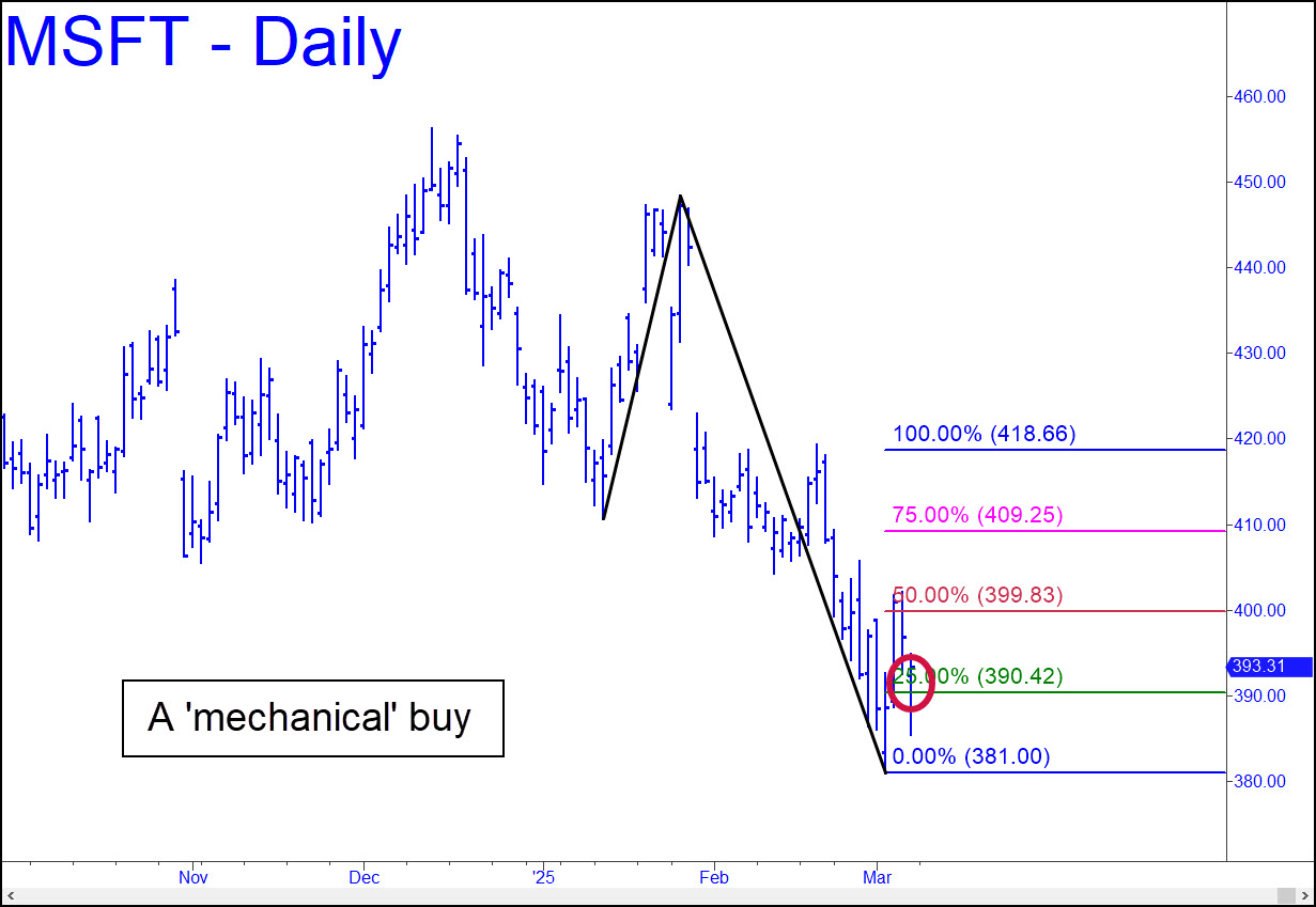 Although a longstanding correction target at 373.39 remains viable, we’ll go with a more timely picture that is bullish and which projects a bounce to as high as 418.66. Friday’s dip to the green line (x=390.43) triggered a ‘mechanical’ buy short that would require a 380 stop-loss, but we’ll paper trade this one for now. It should be good for a ride up to at least p=399.83, but a decisive move through that midpoint Hidden Pivot would open a path to the ‘d’ target at 418 mentioned above. _______ UPDATE (March 10, 11:00 a.m.): My apologies for the rickism of the month. I’ve corrected the trade noted above that was triggered at 390.43, since it was a ‘mechanical’ buy under discussion, not a short sale. Also, in case you didn’t notice, MSFT failed to bounce and is falling with a vengeance, presumably to the 373.39 target we’ve been using for quite some time. _______ UPDATE (Mar 12): The bombed-out low of Microsoft’s 40-point slide over the last three weeks missed my target by 3.52, or 0.9%, but a relapse that would fulfill the target exactly is still possible. It would be worth bottom-fishing.