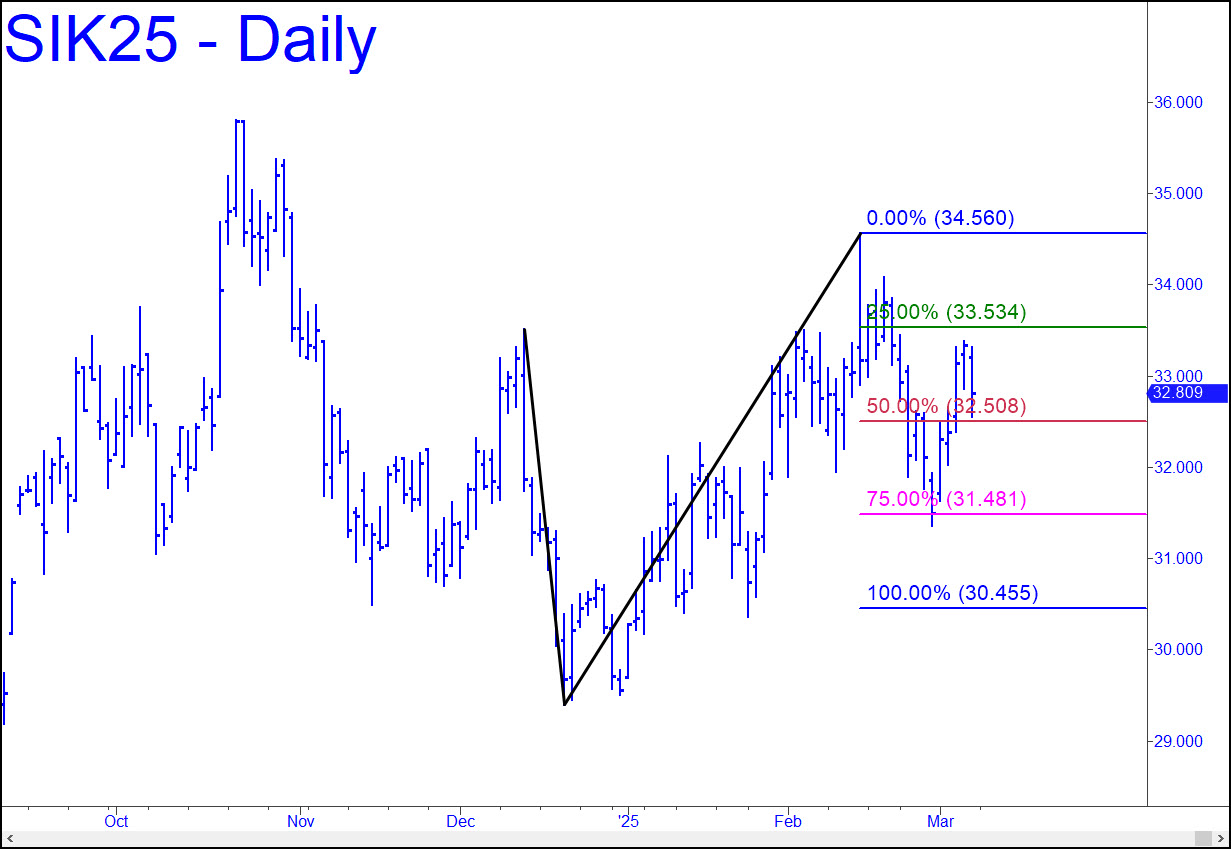 Silver and gold have not quite gone their separate ways, but the latter’s chart looks much more bullish. May Silver came close to triggering a ‘mechanical’ short last week when it rallied to just shy of the green line (x=33.534; the stop-loss would be at 34.57). Regardless of whether it gets there, the burden of proof will be on bulls to sustain altitude. Returning to the secondary Hidden Pivot (p2=32.481) would almost surely grease the skids down to d=30.455. _____ UPDATE (Mar 12, 4:53 p.m.): Silver has taken a big leap this week, but let’s hold the bubbly until such time as it pushes above 34.085. That’s equal to an external peak recorded on Feb 20 whose breach would generate a fresh impulse leg of daily-chart degree. In the meantime, assuming today’s 33.815 high is not exceeded first, you could buy a pullback to 33.230 with stop-loss as tight as six cents. _______ UPDATE (Mar 14, 7:49 a.m. EDT): A Hidden Pivot at 35.565 is the next logical rally target in my sequence, although a bigger picture yields 36.605 as a possibility. If I stretch all the way back to the 2008 low, I could see 42.705, or even 53.06. But no higher. These numbers will not be accurate to the penny because my coordinates come from ‘blended’ composite charts.