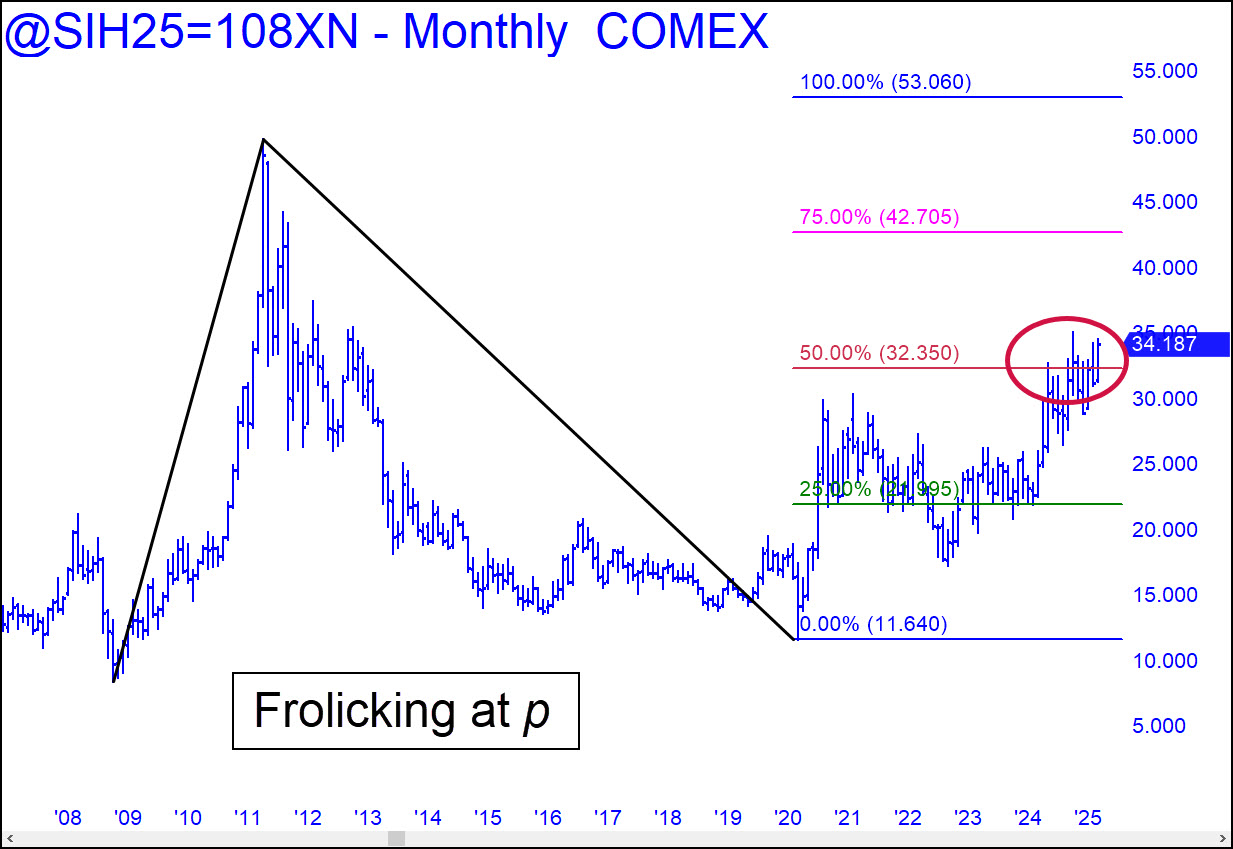 Comex Silver hasn’t exactly shredded the midpoint resistance of the long-term pattern shown in the monthly composite chart. However, it has frolicked and danced there, suggesting that although bulls are in no great hurry to take the futures to as high as $53, they are determined to get there eventually. The target may not seem spectacular, and there are undoubtedly silver bulls hoping for a doubling of 2011’s $50 top. That could still happen, but probably not before a lengthy and deep pullback from 53.06. First, let’s allow bulls to turn the midpoint resistance into support with a patient consolidation above it. Use 36.605, or 37.305 if any higher, as short-term rally targets. Both should evince a tradable pullback.