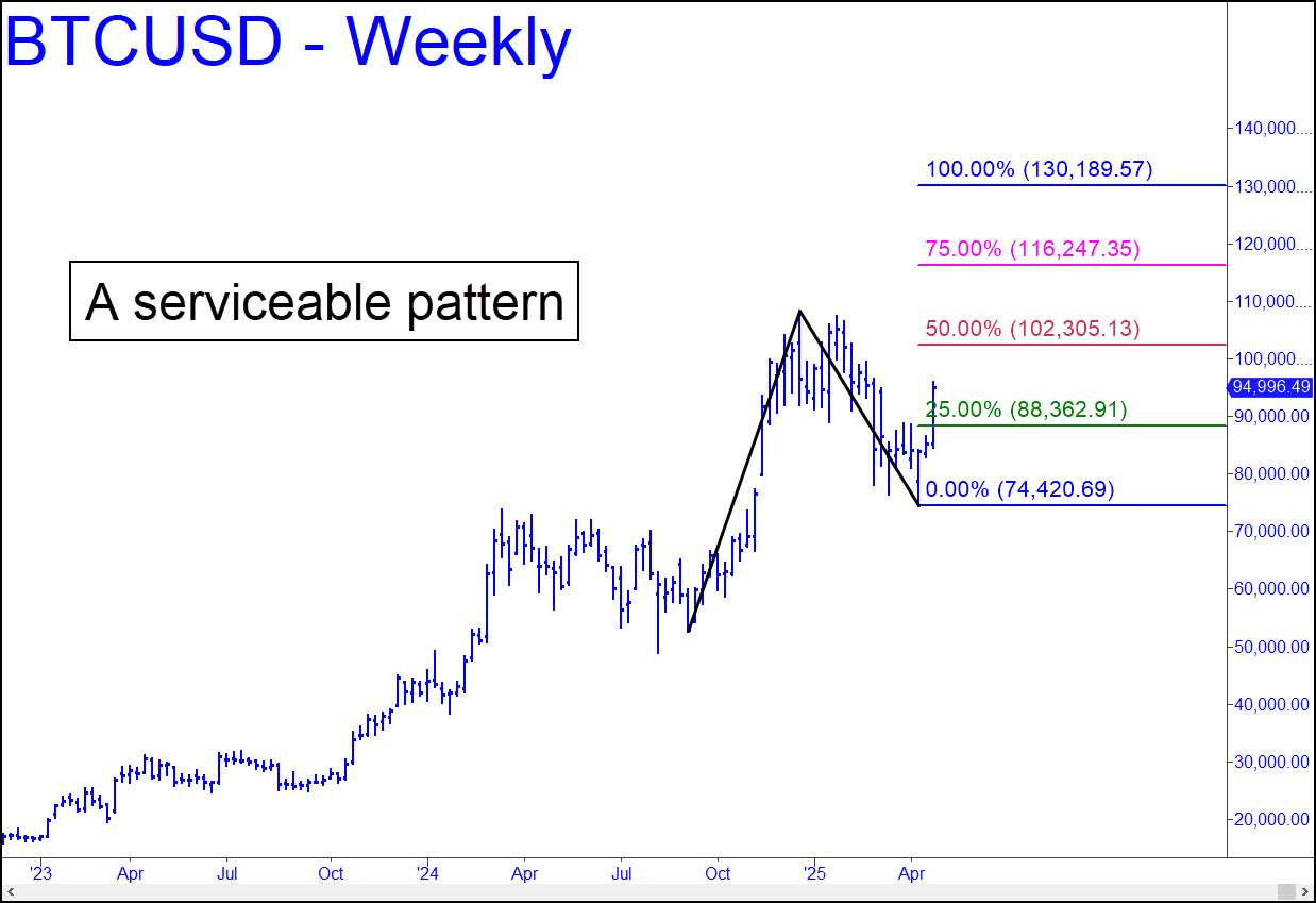 The pattern shown, with a target as high as 130,189, is good enough for government work even though I’ve settled on an indistinct point ‘A’ low that could muddy the D target. Regardless, as I’ve mentioned before, the midpoint pivot is a reliable telltale even when it is embedded in a dubious or too-obvious pattern. It lies at 102,305 here, and so we’ll make that our minimum upside objective for the near term. A decisive push through it on first contact would, of course, shorten the odds of a follow-through to at least p2=116,247, or 130,189 if any higher.