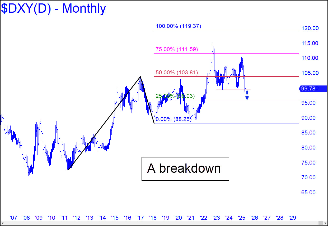 The Dollar Index has broken down with last week’s penetration of a key low at 99.58 that was recorded in July 2023. Expect more weakness down to the green line (x=96.03), at least, before the greenback can turn around. A dip to the line would trigger a ‘mechanical’ buy predicated on a climactic run-up to the 119.37 target. That seems farfetched at the moment, but there is nothing in the chart to suggest the long-term uptrend is over. At the green line, the correction will amount to about 16% from the September 2022 high at 114.78. _______ UPDATE (Apr 21, 4:15 p.m. EDT): Today’s penetration of a 98.04 midpoint Hidden Pivot support was not decisive, but any more weakness will clear a path down to D=95.79 of this pattern. As things stand, a rally to the green line (x=99.16) already would trigger an enticing ‘mechanical’ short that would take a stop-loss at 100.29.