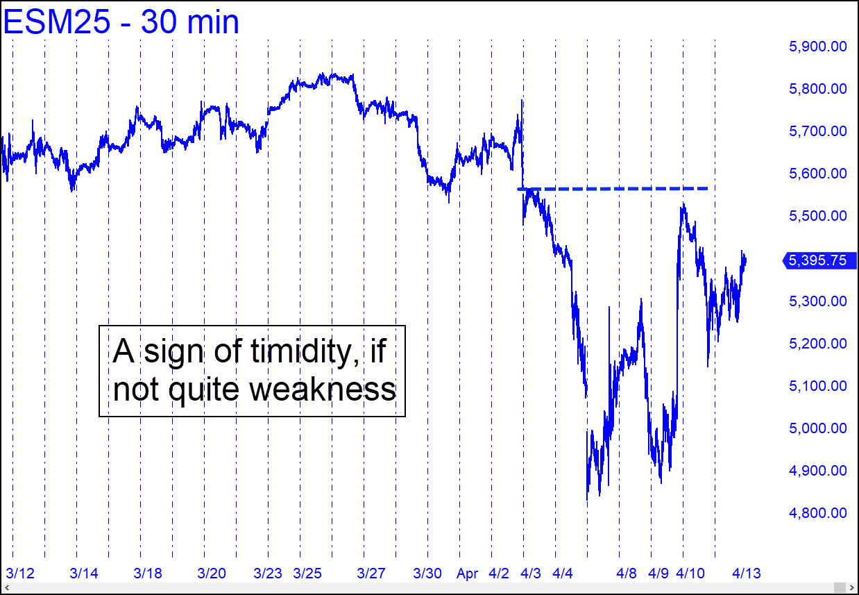 Although the futures have rallied nearly 700 points from last Monday’s Hidden Pivot low, their failure to surpass the small external peak shown in the inset was timid behavior. It also set up a theoretical ‘mechanical’ short at 5406.25 (stop 5529.00) that we’ll ignore. Instead, let’s give bulls the benefit of the doubt for now, meaning we should expect a thrust above the 5528.75 recovery high shortly. Alternatively, a relapse could send the futures down to as low as d=5038.75 in search of traction (60m, a=5322.00 on 4/4). You could bottom-fish there aggressively with a stop-loss as tight as 2-3 points.