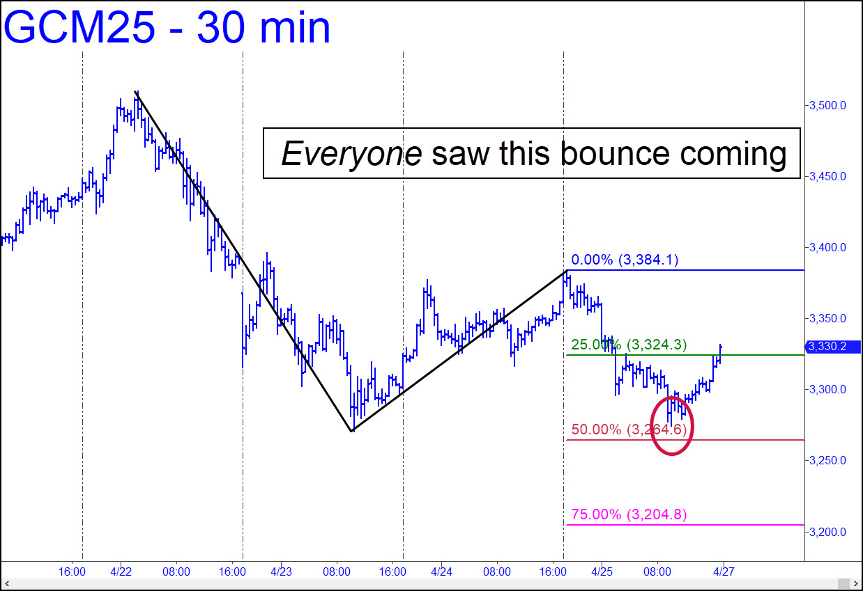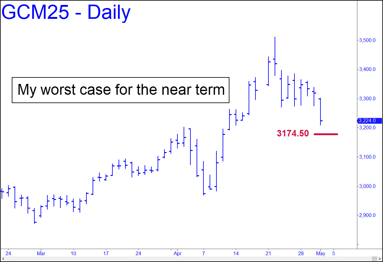 So many traders evidently anticipated Friday’s low that the futures never got there. The peanut gallery would have been focused on Wednesday’s 3270.80 bottom as a logical place for a test of support. It was not to be, however, and my 3264.60 midpoint support finished even further out of the money when the June contract turned higher from 3274.80, a number in the middle of Nowheresville. The subsequent bounce was impulsive on the hourly chart, implying bulls had a reason to hold a position over the weekend. This seems a little too pat to me, but I won’t let skepticism cloud my thinking if bullion wants to go higher when the futures start trading again Sunday afternoon. _______ UPDATE (May 1, 12:52 p.m. EDT): Gold’s weakness appears to be merely corrective, and you can therefore expect an upturn from no lower than 3174.50. That’s a Hidden Pivot support that lies about $80 below the current price, 3225. A second possibility, dimming at the moment, would be for this morning’s so-far low at 3209.40 to support a strong rally. That’s a ‘secondary’ Hidden Pivot, and it is capable of turning things around. The so-far moderate decline since April 22 occurred after June Gold peaked within 0.6% of a 3533.90 Hidden Pivot I first featured here when the futures were trading below $2800. It stood to be a potential stumbling block, and that has been the case. However, I doubt that gold has topped for good and expect it to reach $ 5,000 an ounce or more eventually.