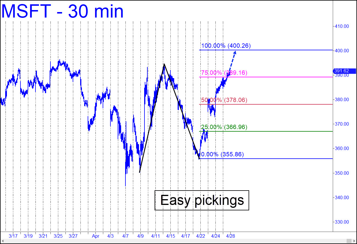 MSFT should have little difficulty reaching the 400.26 rally target early in the week. If the ‘D’ target were not such a juicy round number, I’d recommend shorting there aggressively. However, many traders will be counting on it to halt the stock’s ascent temporarily. The bar that pushed the stock past p=378.06 was bluntly decisive, implying you could buy the stock anywhere above C=355.86 and be confident of cashing it out eventually at 400.26. For better risk management, though, you should try to get long using a ‘camouflage’ trigger from the 5- or 15-minute chart.
