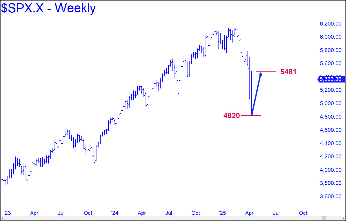 [Just ahead of last Monday’s steep plunge, I predicted here that an S&P reversal from 4820 would mark the end of the bear market. So far, SPX has rallied 646 points off an actual low at 4835. Bulls are not yet out of the woods, however, since a relapse could occur at any time. The stock market remains spooked by Europe’s dumping of Treasury paper in a deliberate attempt to destabilize the U.S. financial system. With the EU economy swirling down the crapper, the globalists are desperate to force Powell to ease in order to rescue big hedge funds that were leveraged up to their eyeballs with Treasury paper. So far, the Fed chairman has stood his ground, and it appears the EU attempt to sabotage the U.S. bond market will fail. In any event, the commentary below will continue to run until the S&Ps crash the 4820 Hidden Pivot and prove me wrong. If you keep my thesis in mind — that as long as 4820 holds, there will be no recession, nor any harmful effects from Trump’s tariffs — you will be better able to judge the jaw-dropping stupidity of the mainstream media’s coverage of Trump 2.0. Because of their blind hatred of the president, the eggheads and benighted editorialists will continue to get everything wrong until stocks are once again soaring to new all-time highs. RA]