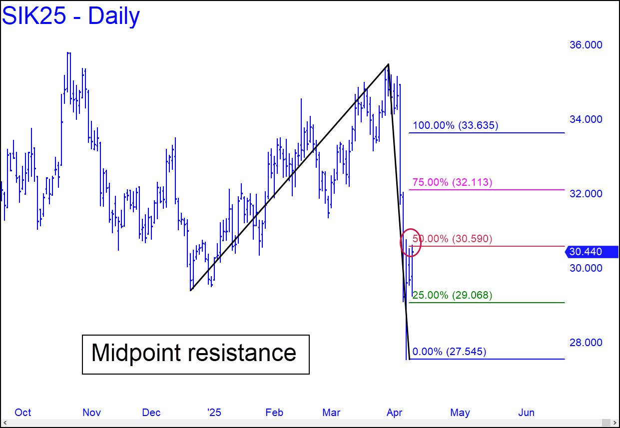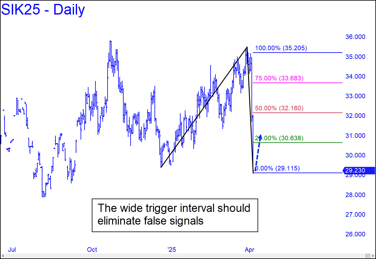 Talk about overdone! I could have used a small a-b- segment to make trading the pending bounce less risky, but because the move higher is likely to exhaust the levels of the larger pattern, including its 35.205 target, I’ve featured the bigger picture. The futures could still work their way lower before turning around, but a voodoo number at 28.260 is the only spot that looks interesting for purposes of bottom-fishing. Otherwise, a ‘trigger’ rally to the green line should be regarded as a reliable signal of a reversal, even if it is too belated to get us in near the bottom. _______ UPDATE (Apr 7, 9:28 a.m. EDT): Based on an actual low at 27.545, the trade triggered at x=29.068 and produced a quick, relatively painless profit so far of $30,440 (!) on four contracts at p=30.590. Any contracts still held should use a 33,635 target. You can augment the position with a ‘mechanical’ bid at 29.068, stop 27.540. _______ UPDATE (Apr 9, 9:45 a.m. EDT): The May contract has stalled at the 30.590 midpoint Hidden Pivot associated with the 33.635 target furnished above. With gold soaring, the stall is unlikely to last. A pullback to x, especially if it comes from the sweet spot between p and p2, would generate a strong ‘mechanical’ buy.