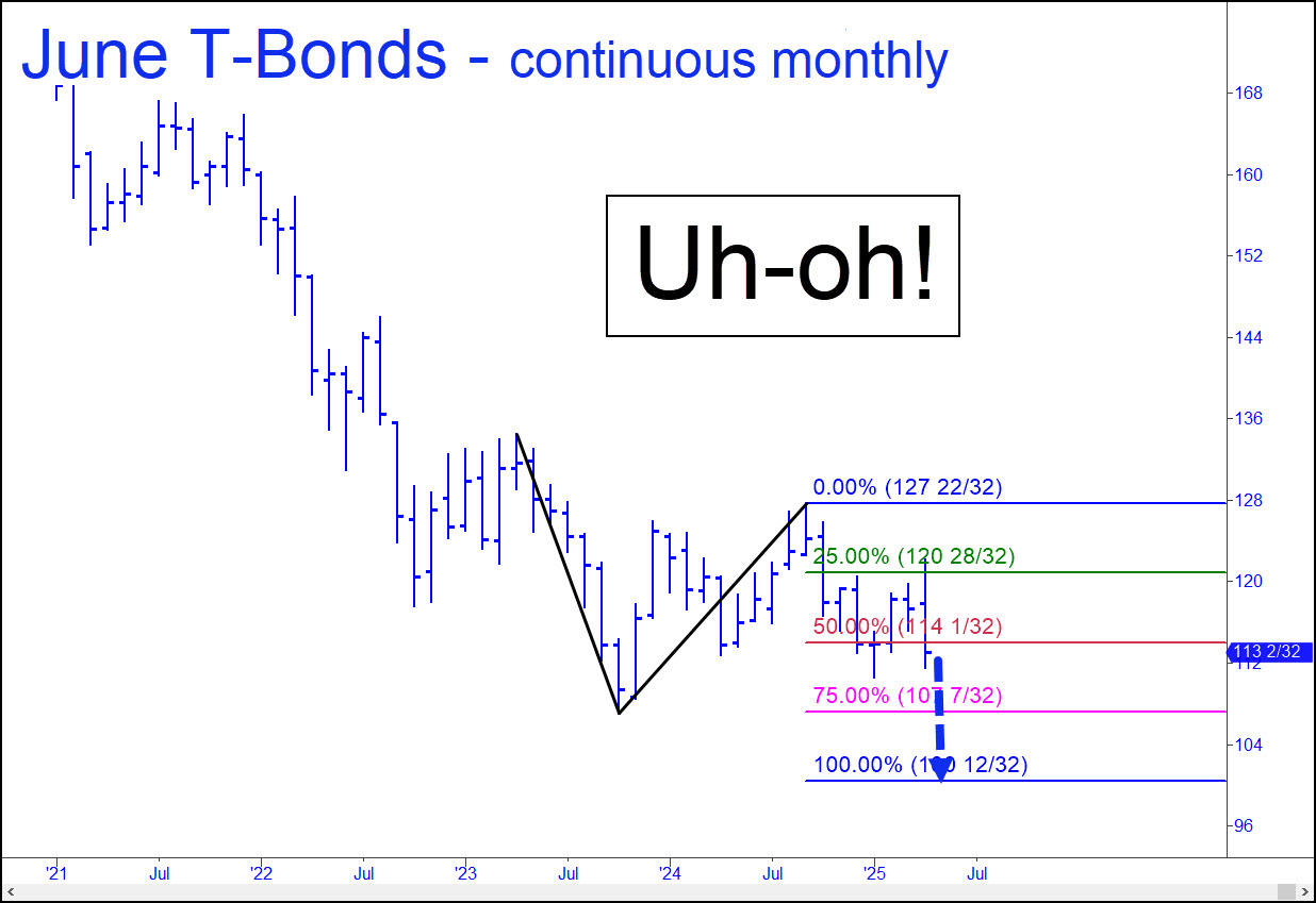 A reported $7.5 trillion in Treasury debt needs to be refinanced over the next three years, with much of it due in 2025. It is therefore a particularly bad time for the Masters of the Universe to lose control of long-term rates. Beleaguered consumers will struggle even harder, and an already tottering commercial real estate market will finally give up the ghost. Residential real estate is about to deflate as well, putting a potentially economically rejuvenating refinancing cycle so far out of reach that Baby Boomers might not see another in their lifetime. Trump will get the blame, and deservedly so. Usually, economic cycles of boom and bust are much bigger than the presidency, but in this case, if stocks continue to fall, Trump will surely have been the catalyst. _______ UPDATE (April 25): Last week’s rally left the futures a hair shy of an important Hidden Pivot midpoint resistance at 116^14. A decisive move through it would not announce that the bear market is over, but it would quietly suggest an important turn may be nigh. It would also imply the futures are on their way to 121^11, a Hidden Pivot that would leave the June contract just short of a breakout. The pattern will not be comfy-cozy for seasoned Pivoters, but I am using it nonetheless, in part because of its obscurity. (Always keep in mind our rule concerning Hidden Pivot midpoints in odd or unseemly patterns: they work anyway.) _______ UPDATE (Apr 29, 3:38 p.m. EDT): The futures have finally punched through the 116^14 resistance, but because it took so long (three weeks), there can be no assurance that 121^11 will be reached. Although this seems likely, I’ll suggest using p2=118^29 as a minimum upside objective for the time being. Here’s a timely chart.