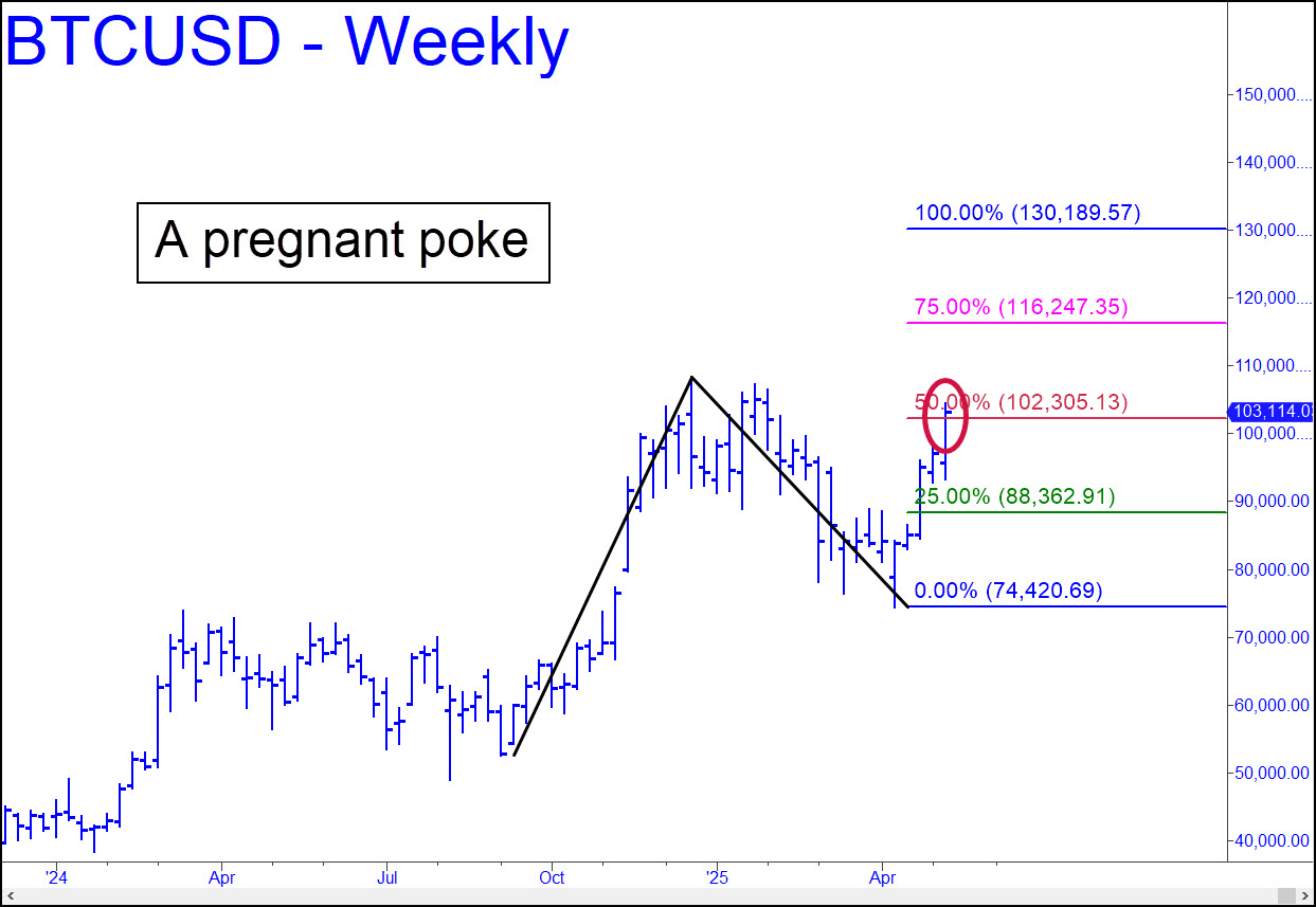 Bitcoin’s poke last Thursday above a 102,355 ‘midpoint Hidden Pivot’ has shortened the odds that it will reach the 130,189 target. (Note: Because of a change in my coordinates, these numbers differ slightly from the price points given here earlier.) Moreover, a pullback to x=88,362 (the green line), however unlikely, would trigger a juicy theoretical ‘mechanical’ buy, stop 74,419. Let’s wait and see how easily and/or decisively the upthrust exceeds p on first contact. Two consecutive weekly closes above it would all but clinch more upside to at least p2=116,247.